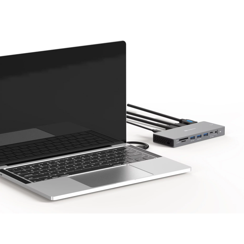 Boîtier en aluminium - Entrée : USB-C mâle - Connecteurs : 1 port USB-C femelle pour l’alimentation (jusqu’à 100 W), 1 port USB-C pour le transfert de données, 2 ports HDMI femelles, 1 port DisplayPort femelle, 3 ports USB 3.0 A femelles, 1 port USB-C 3.1, 1 port RJ45 femelle, 1 sortie audio - 1 emplacement pour lecteur de carte SD compatible SD/SDHC/SDXC/MMC - 1 emplacement pour lecteur de carte Micro SD/TF - 1 connecteur RJ45 prenant en charge un débit de 10/100/1000 Mbps - Compatible avec : Windows 10 / 11, macOS - Prend en charge le mode étendu et le mode miroir MST (Windows). (MacOS M1 uniquement, mode miroir) - Prend en charge la sortie simultanée sur 2 ports HDMI et 1 port DP (si utilisé sur un ordinateur portable, l'écran de ce dernier peut également être actif, ce qui signifie que vous disposerez de 4 moniteurs au total) - Résolution HDMI 2.0 / DP 1.4 jusqu'à 4K à 60 Hz