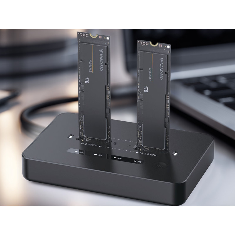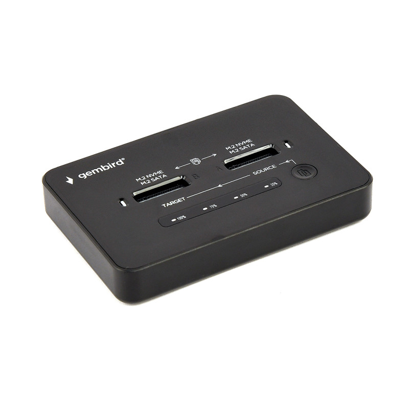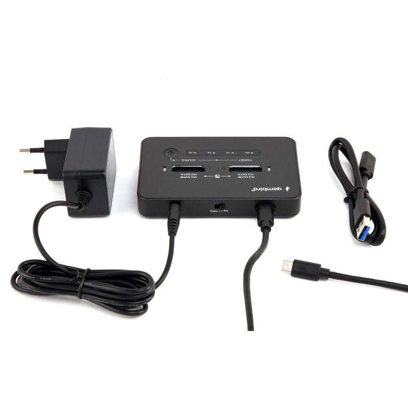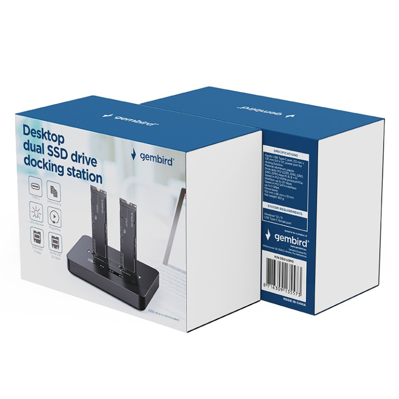 Station d'accueil Gembird double disque SSD USB Type-C M.2 NVMe et SATA - Entrée : port USB Type-C ; port d’alimentation 5 V CC (3,5 mm x 1,35 mm) pour la fonction de clonage - chipset : RTL9220DP USB 3.2 Gen2x2 - emplacements pour disques : M.2 (2230, 2242, 2260, 2280, 22110) clés M, B, B+M jusqu’à 4 Go chacun - vitesse en interface PCIe (protocole NVMe M.2) : jusqu’à 20 Gbit/s - vitesse en interface SATA M.2 : jusqu’à 5 Gbit/s - Prend en charge deux disques SSD M.2 NVMe et SATA - Compatible avec les MacBook et les PC - dimensions : 102 × 66 × 13 mm - poids net : 160 g - Couleur Noir - Garantie 1 an
