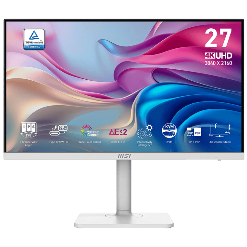 Écran MSI MODERN 27" 4K - Résolution : 3840 x 2160 (UHD) - Taux de rafraîchissement : 60 Hz - Courbure Plat - Temps de réponse : 4 ms (GtG) - Type de panneau : IPS - Luminosité : 400 cd/m² - Angle de vision: 178° (H) / 178° (V) - Rapport D'aspect : 16:9 - Rapport de contraste : 1000:1 - Traitement de surface : Antireflet - Prise en charge HDR : DisplayHDR 400 - Synchronisation adaptative - Ports vidéo : 1x DisplayPort 1.4a, 1 port USB-C (alternatif DP), 2x HDMI 2.0b - Ports USB : 3x USB 5 Gbit/s de type A, 1x USB 5 Gbit/s de type B - 1x sortie casque - haut-parleurs intégrés : 2 x 3 W - Montage VESA 75 x 75 mm - inclinaison : -5° ~ 20°, pivotant : -30° ~ 30°, Pivot : -90° ~ 90°, hauteur : 0~110 mm - Dimensions (L x P x H) : 613,5 x 63,8 x 362,3 mm - Poids 6,55 kg - Garantie 1 an