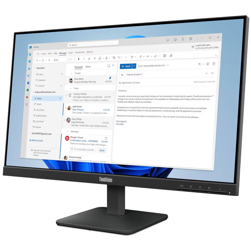 Écran Lenovo Think Vision S24-4e 23.8" Full HD - Résolution : 1920 x 1080 px - Taux de rafraîchissement 100 Hz - Rétroéclairage WLED - Ratio d'aspect 16:9 - Angle de vue (H/V) : 178° / 178° - Temps de réponse : 4 ms GtG (mode extrême) / 6 ms GtG (mode normal) - Luminosité : 250 cd/m² - Contraste : 1300:1 - Gamme de couleurs : 99 % sRGB - Surface de l'écran Anti-éblouissement - Connecteur vidéo : 1x HDMI 1.4, 1x VGA - Rester : Inclinaison - Dimensions (Position la plus haute/Position la plus basse) : 539,8 x 180,0 x 402,9 mm - Poids avec support : 3 kg - Compatible avec les supports VESA 100 x 100 mm - Consommation électrique : typique 16 W / maximale : 19 W - Compatible avec Windows 10 et 11 - Couleur Noir - Garantie 3 ans