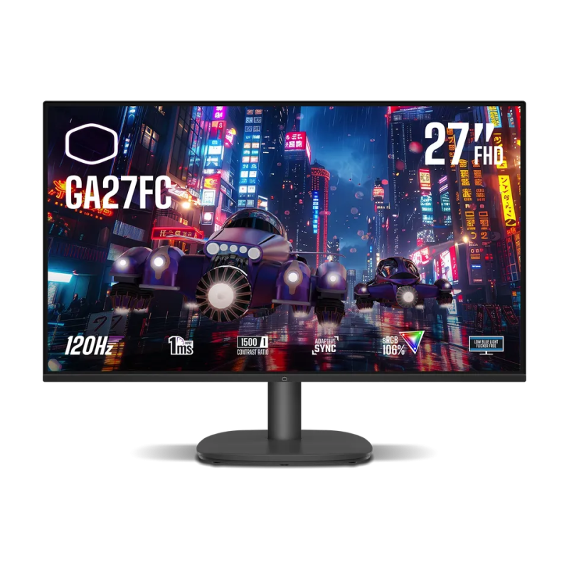 Écran Gaming Cooler Master GA27FC 27" - Résolution: Full HD (1920 x 1080 px) - Taux de rafraîchissement : 120 Hz - Rapport : 16:9 - Panneau: IPS - Rapport de contraste: 1500:1 - Angle de vision (H/V): 178°/178° - Luminosité: 250 nits - Temps de réponse: 1 ms (MPRT), 4 ms (GtG) - Connecteurs: 1x HDMI, 1x VGA - VESA: 100x100 mm - Réglage de l'inclinaison: -5°~+20° - Protection des yeux: Faible lumière bleue (S/W) - Technologie VRR: Synchronisation adaptative - Technologie Overdrive - Couleur Noir - Garantie 1 an