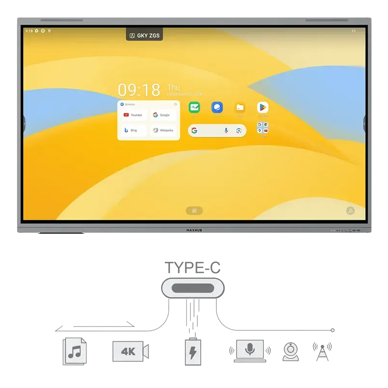 Écran interactif MAXHUB 65'' - Résolution 4K : 3840 (H) × 2160 (V) - Luminosité du panneau : 450 nits (max.) - Rapport d'aspect : 16:9 - contraste : 5 000:1 (typ.) - Technologie de surface : Anti-reflets - Taux de rafraîchissement : 60 Hz - Temps de réponse : 6,5 ms - Unité de rétroéclairage : DLED - Technologie tactile : Reconnaissance infrarouge - Système opérateur : Android 14.0 - RAM : 8 Go DDR4 - ROM : 128 Go - Processeur octocœur A72×4 + A53×4, 2,2 GHz - Connectivité : 3x HDMI, 1x USB 2.0, 4x USB 3.0, 2x USB-C, 1x DisplayPort, 1x VGA, 1 port RS232, 1x RJ45, 1 lecteur de carte TF - Wi-Fi 6, Bluetooth 5.2 - Système audio SkyWave - Chaîne sonore : 2.2 - Puissance du haut-parleur : 2×8W+2×18W (sortie) / 2×12W+2×25W (maximum) - Niveau de pression acoustique : 88 dB (1W, 1m) - anti-scintillement, réduction de la lumière bleue - Alimentation : 100-240 V~ 50/60 Hz 3,5 A - Garantie 1 an