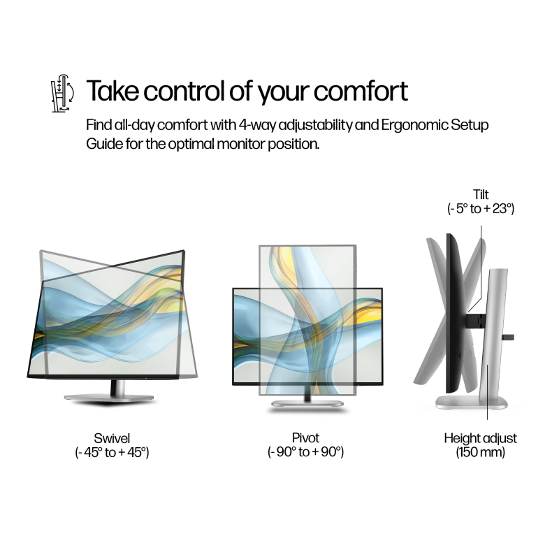 Écran HP Série 5 PRO 524pn 24'' WUXGA - Technologie de dalle : IPS, LCD - Fonctions d'affichage : Réglage en hauteur, inclinaison, rotation, pivotement - Résolution native : WUXGA (1920 x 1200) - Rapport de contraste : 1500:1 - Luminosité : 350 nits - HDCP - Connectivité : 1x HDMI 1.4 - 1x DisplayPort 1.2, 4 ports USB Type-A (vitesse de transfert de 5 Gbit/s), 1x USB-B - Montage VESA : 100 x 100 mm - Traitement de l’écran : Antireflet - Rotation : ±45° - Inclinaison : -5 à +23 °C - Angle de vision Horizontale / Verticale : 178° / 178° - Pivot : ±90° - Format de l'image : 16:10 - Type de rétroéclairage : Éclairé à la périphérie, WLED - Anti-scintillement - Faible Lumière bleue - Fréquence de rafraîchissement : 100 Hz - Temps de réponse : 5ms GtG - Dimensions avec socle : 53,28 x 18,95 x 51,75 cm - Poids : 5,1 kg (avec socle) - Couleur Noir - Garantie 1 an