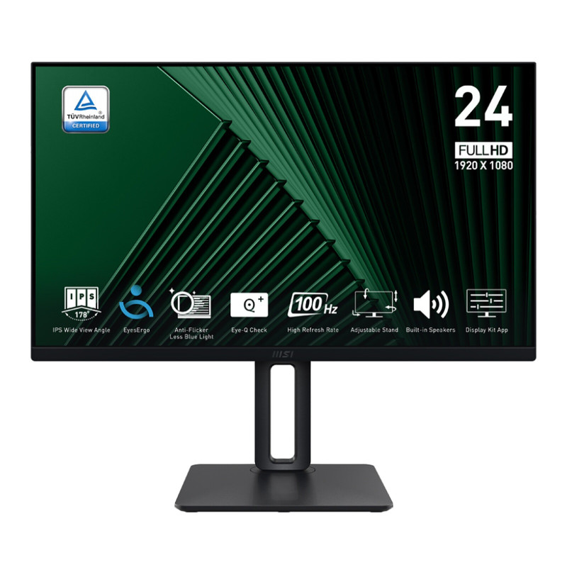 Écran MSI PRO MP245PG 23.8'' FHD - Résolution 1920 x 1080 px - Type de panneau IPS - Taux de rafraîchissement : 100 Hz - Luminosité 300 cd/m² - Contraste 1300 /1 - Temps de réponse 1 ms (MPRT) / 4 ms (GTG) - Angle de vision 178° (H/V) - traitement de surface : Anti-éblouissement - Haut parleur 2 x 2 W - Ports vidéo : 1x HDMI, 1x DisplayPort, 1x D-Sub (VGA) - Ports Audio : 1 sortie casque, 1 entrée ligne - Montage vesa : 100 x 100 mm - Technologie Adaptive-Sync - Inclinaison : -5° ~ 20° - Réglage (pivotant) : -30° ~ 30° - Réglage (pivot) : -90° ~ 90° - Réglage (hauteur) : 0 ~ 120 mm - Dimensions : 539,8 x 400,8 x 288,9 mm - Couleur noir - Garantie 1 an