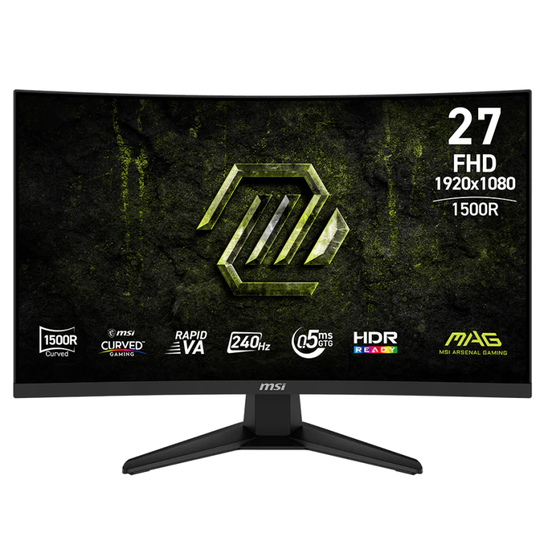 Écran Gaming MSI MAG275CF X24 CURVED 27" - Résolution : Full HD ( 1920 x 1080 px ) - Type de panneau : Rapid VA - Courbure 1500R - Taux de rafraîchissement : 240 Hz - Temps de réponse : 0.5 ms (GtG, min) - Angle de vision : 178° (H) / 178° (V) - Luminosité : SDR : 300 cd/m² - Contraste : 4000:1 - Compatible HDR - Ports vidéo : 1x DisplayPort (1.2a), 2x HDMI (2.0b) - Ports audio : 1x sortie casque - Traitement de surface : Anti-éblouissement - Technologie Adaptive-Sync - Inclinaison : -5° ~ 20° - Écluse de kensington - Conception sans cadre - Montage VESA : 100 x 100 mm - Dimensions avec support (L x P x H) : 611,5 x 249,7 x 439,1 mm - Garantie 1 an