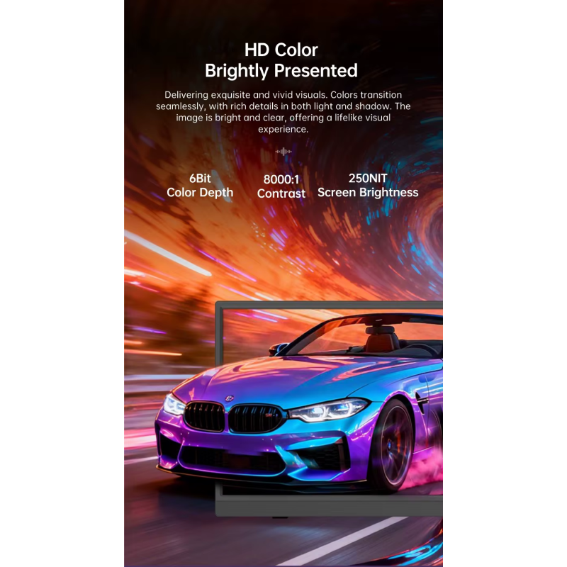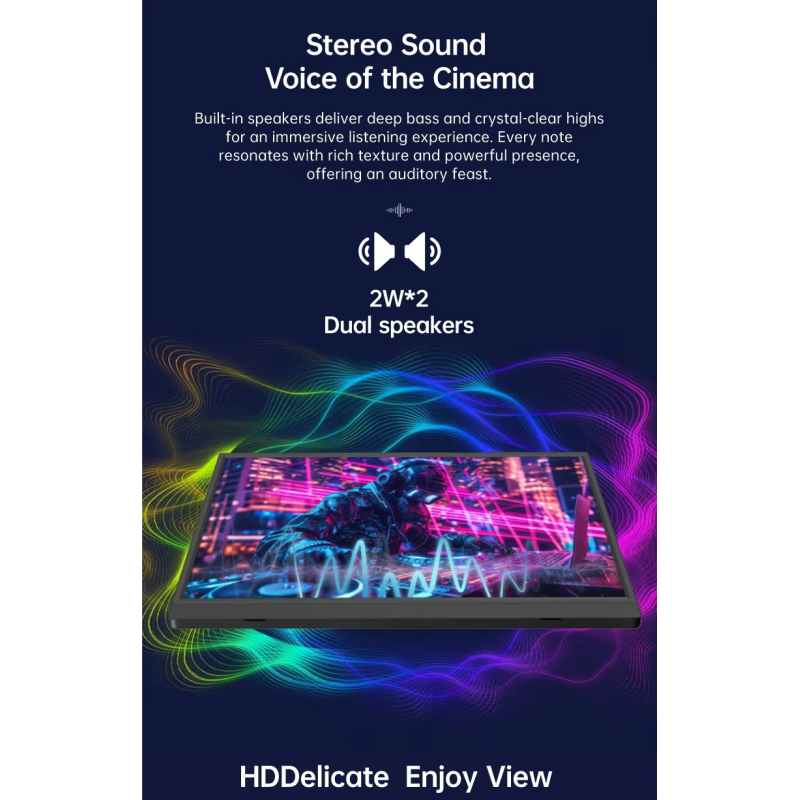 Écran Portable M02Z 15.8 pouces LCD IPS - Résolution : 1920 × 1080p - Rapport de contraste : 800:1 - Format d'image : 16:9 - Luminosité de 250 nits - Temps de réponse : 5 ms - Deux haut-parleurs stéréo 2x 2W - Son surround 360° à deux canaux pour une expérience immersive - Support monobloc rotatif à 90° horizontalement et verticalement - Connecteurs : 2 ports USB-C, 1 port Mini HDMI, 1 prise audio 3,5 mm - Appareils compatibles : PS3/4/5, Xbox, smartphones, ordinateurs portables et PC - Systèmes d'exploitation compatibles : Android, Apple, Microsoft - Poids : 840 g - Couleur noir - Garantie 1 an