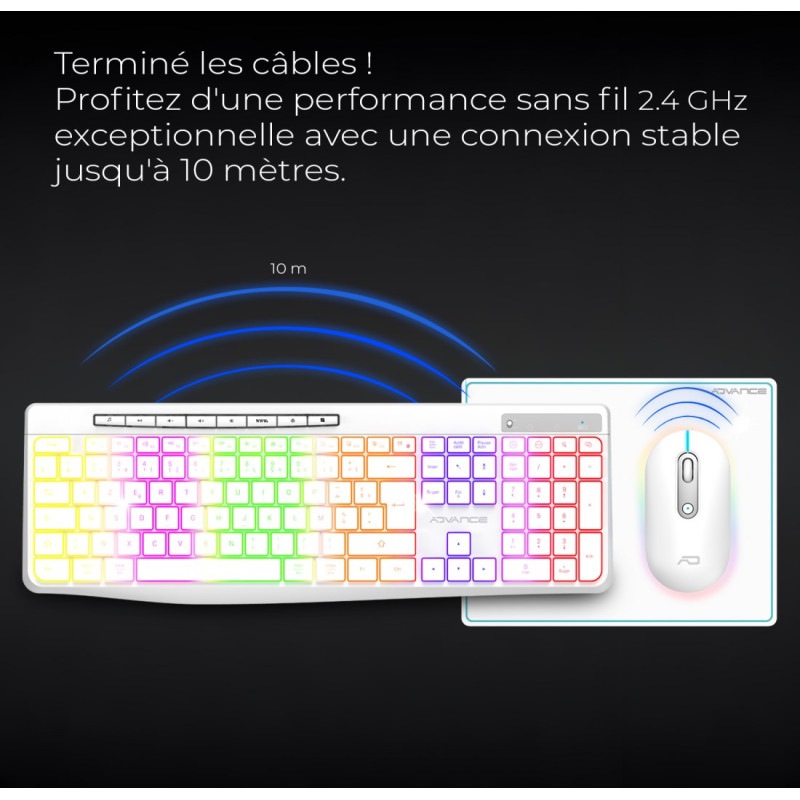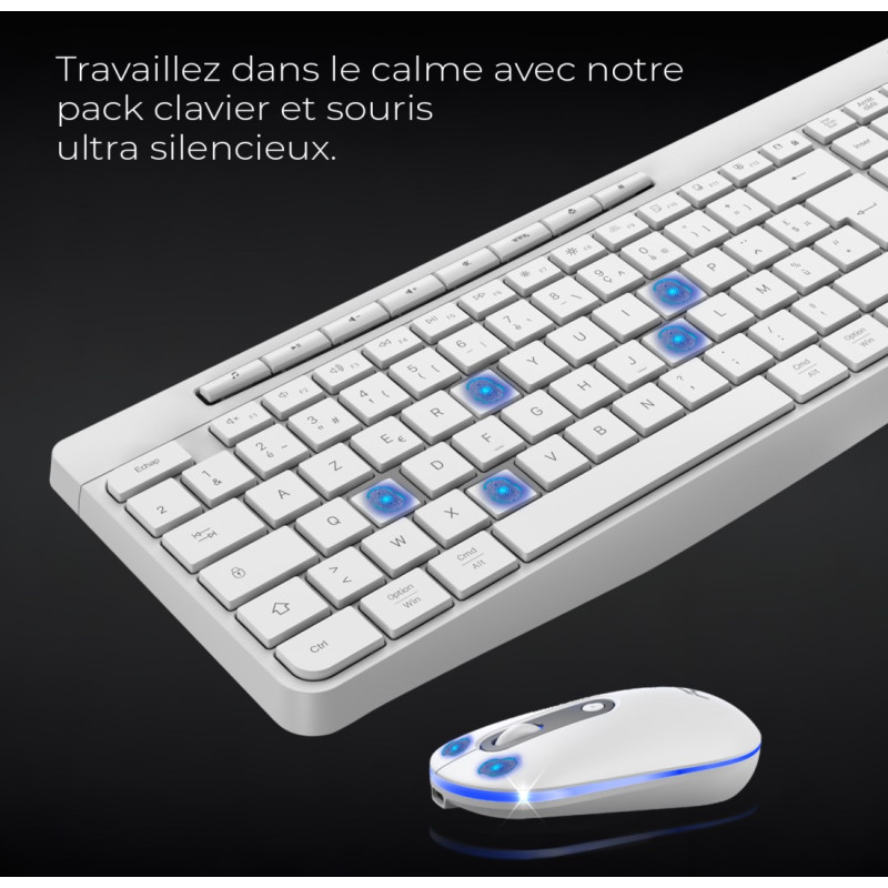 Clavier : sans fil 118 Touches "Low profile" - 10 touches spéciales mumltimédia - 12 raccourcis multimédia - Technologie sans fil RF 2.4 GHz - Antighosting Rollover 4 touches - Batterie lithium rechargeable 1000 mAh - Norme AZERTY - Hauteur du clavier réglable 1 position - Indicateur LED Batterie - Indicateurs LED - Mode économie d'énergie (On/Off) - Patins silicone - Rétro-éclairage RGB Rainbow - Touches silencieuses - Waterproof IPX4 - Souris : 4 Boutons + Molette de défilement 4 - Batterie lithium rechargeable 500 mAh - Capteur optique 1600 DPI max - Clics souris silencieux - Résolution réglable - Technologie sans fil RF 2.4 GHz - Rétroéclairage RGB 15 effets + 7 Couleurs - Compatibilité Windows et Mac - Contenu de l'emballage - Clavier + Souris + Tapis R-Type + Câbles USB Nano récepteur USB - Couleur Blanc - Garantie 1 an