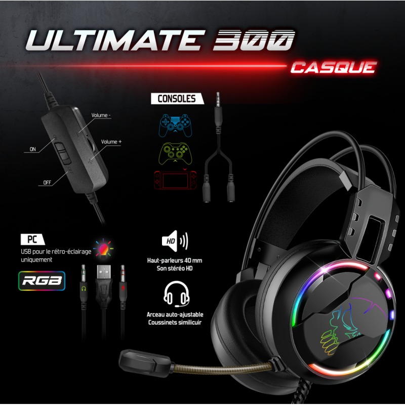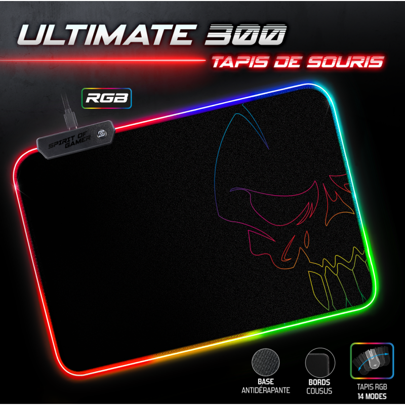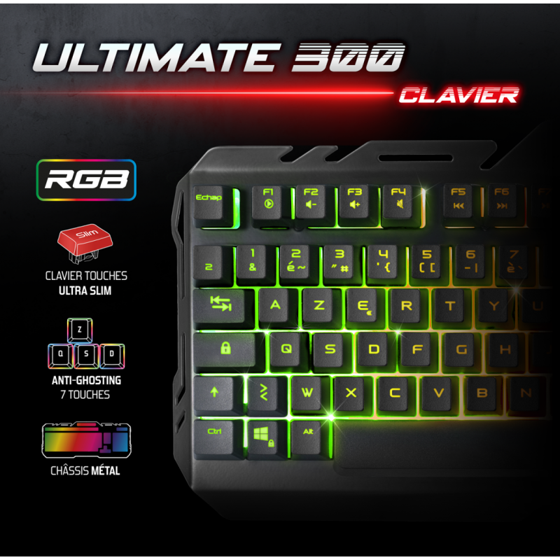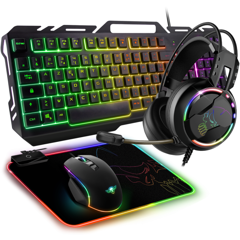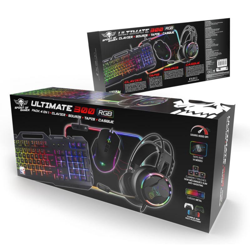 Pack Gaming ULTIMATE 300 4EN1 Spirit Of Gamer - Clavier : Nombre de Touches : 105 Touches ultra slim - 7 Touches Antighosting - 12 Raccourcis multimédia - Norme : Azerty - Rétro-éclairage RGB Rainbow - Réglable en hauteur 1 position - Longueur du câble USB 1.5 mètre | Souris : 7 Boutons - DPI ajustable : 800, 1600, 2400, 3200, 4800, 8000 DPI - Résolution 8000 DPI max - Polling rate 125 Hz - Accélération 32G - Vitesse 32 IPS - Longueur du câble USB 1.5 m | Tapis de souris : Surface souple et base du tapis antidérapante - Dimensions : 35 x 25 x 0.3 cm - Rétro-éclairage RGB 14 Modes : 8 couleurs + 6 effets dynamiques - Câble USB 1.5 mètre | Casque : Haut-parleurs de 40 mm - Rétro-éclairage RGB - Télécommande filaire (Volume réglable / Mute micro) - Câble principal 2 mètre : prise jack 3.5 mm (Audio / Micro) - Adaptateur consoles : PS4, Xbox One, Switch - Couleur Noir - Garantie 1 an