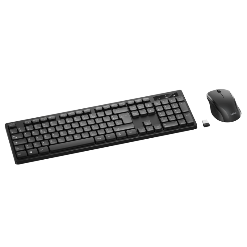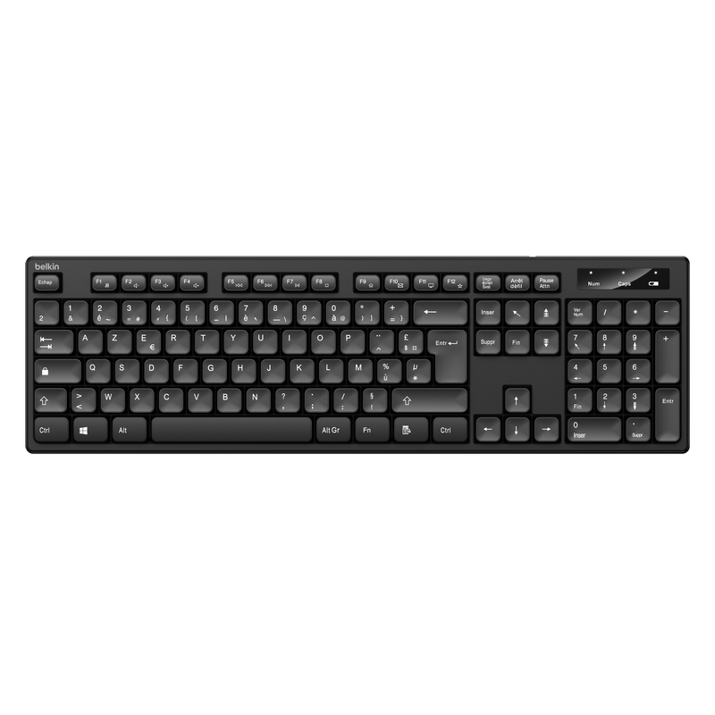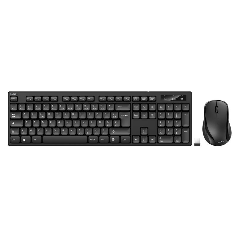 Ensemble Clavier et Souris Sans Fil Belkin - Connexion sans fil de 2,4 GHz - Interface : USB - Norme Clavier : AZERTY - Clavier avec touches fines et fonctions multimédias - Souris ambidextre compacte aux formes arrondies avec 3 boutons et une molette de défilement - Dimensions : Clavier : 43,2 cm x 12,9 cm x 2 cm / Souris : 10,9 cm x 6,9 cm x 3,8 cm - Couleur Noir - Garantie 1 an