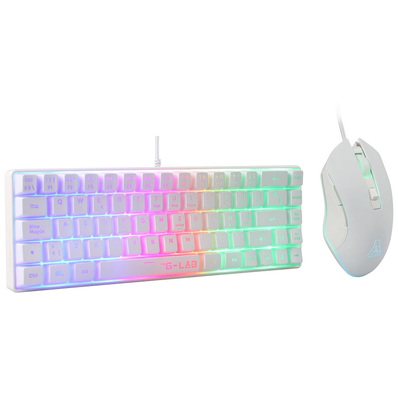 Ensemble Clavier & Souris Gaming THE G-LAB Combo Hydrogen - Norme Clavier AZERTY - Type de clavier : Membrane - Connectivité : Filaire - Interface : USB - Éclairage RGB - souris Optique - Résolution : 6400 dpi - Nombre de boutons 6 - Couleur Blanc - Garantie 1 an
