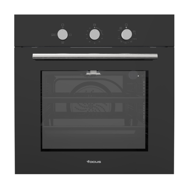 Four Encastrable à Gaz Ventilé Focus F536X - Capacité 58 Litres - Dimensions 60cm - 7 Programmes - Chaleur tournante - Tourne broche - Minuterie - Porte froide - Classe Énergétique A - Couleur Noir - Garantie 2 ans