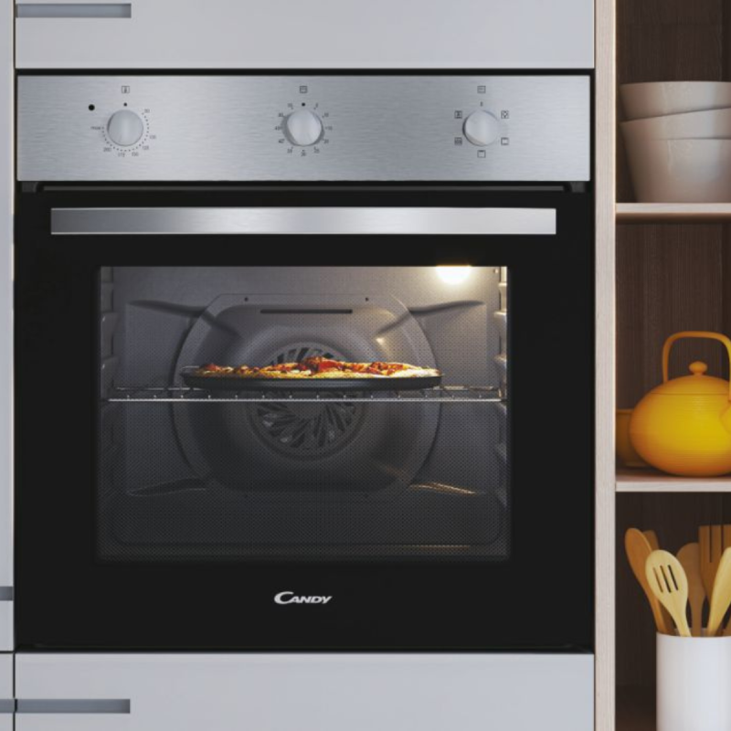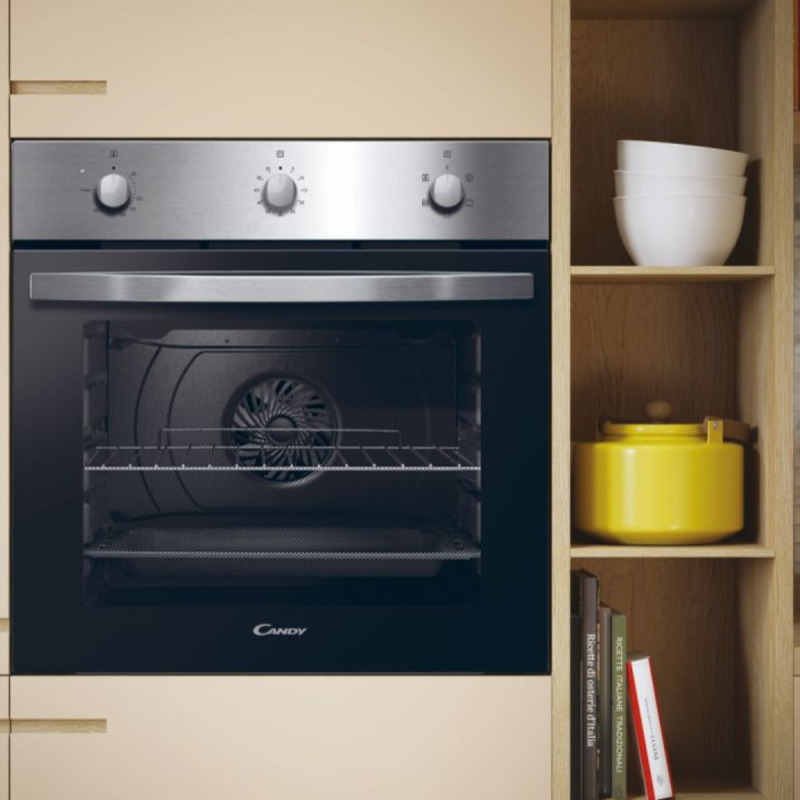 FOUR ENCASTRABLE CANDY FIDCX502 - Chaleur tournante - Volume cavité: 65 litres - Contrôle Mécanique - 1x Plateau 40 mm - 2x Grilles - 5 Fonctions - Porte en Verre - Classe énergétique A - Dimensions: 595 x 595 x 568 mm - Poids 24.1 kg - Couleur Inox - Garantie 1 an