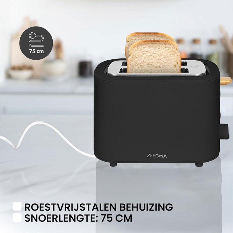 Grille Pain ZEEGMA - Capacité : 2 tranches de pain - Puissance : 680-820 W - Fonctions : Fonction dégivrage, fonction réchauffage - Modes de cuisson : 3 modes de cuisson - Bac à miettes - Boîtier en acier inoxydable - Cordon d'alimentation : 75 cm - Poids : 1 kg - Dimensions : 27 x 16,5 x 18 cm - Couleur : Noir - Garnatie 1an