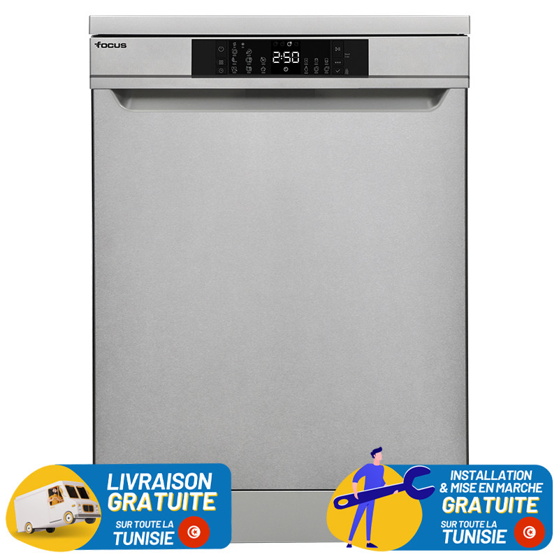Lave Vaisselle FOCUS Pose Libre - Capacité : 13 Couverts - Classe énergétique : A++ - Nombre de programmes : 8 programmes - Départ différé : 1 – 2 / 24h - Nombre de températures : 4 températures - Afficheur LED - Niveau sonore : 47dB - Consommation d'eau : 9 Litres - Dimensions : 85 x 60 x 60cm - Couleur : INOX - Garantie 2 ans