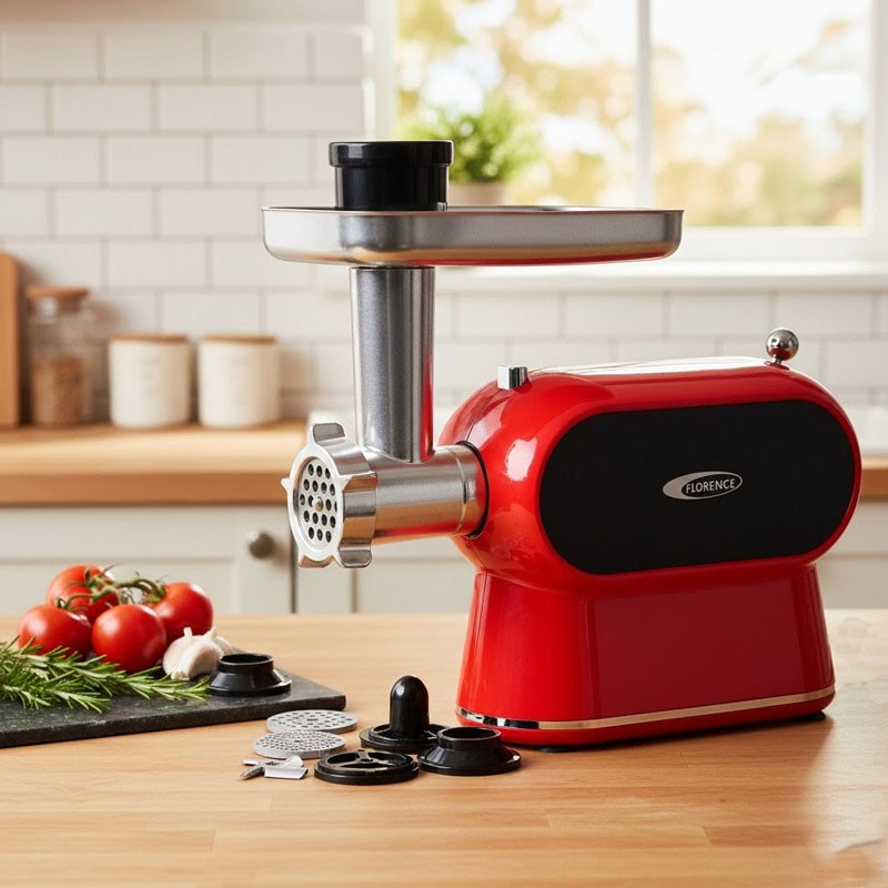 Hachoir à Viande FLORENCE - Puissance : 2000W - 3x Grilles de hachage - Fonctions : Hacher / émincer / broyer - Lames : Acier inoxydable - Sécurité : Surchauffe + pieds antidérapants - Pièces amovibles faciles à nettoyer - Couleur : Rouge - Garantie 1an