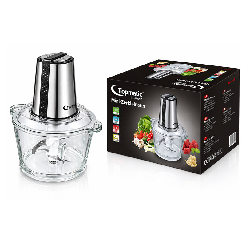 Mini Hachoir TOPMATIC - Capacité : 1.6 Litre - Bol en Verre - Puissance : 300W - Nombre de Vitesses : 2 vitesses - Nombre de Lames : 2 Lames en acier inoxydable - Bol pièces allant au lave vaisselle - Couleur : inox - Garantie : 1 an