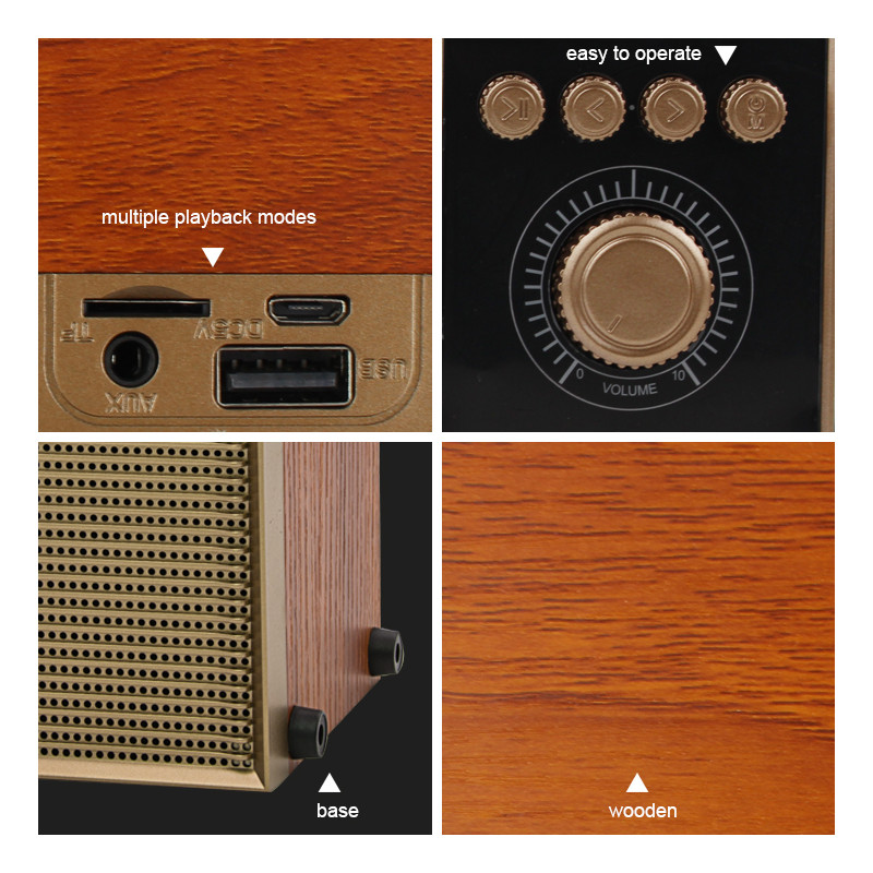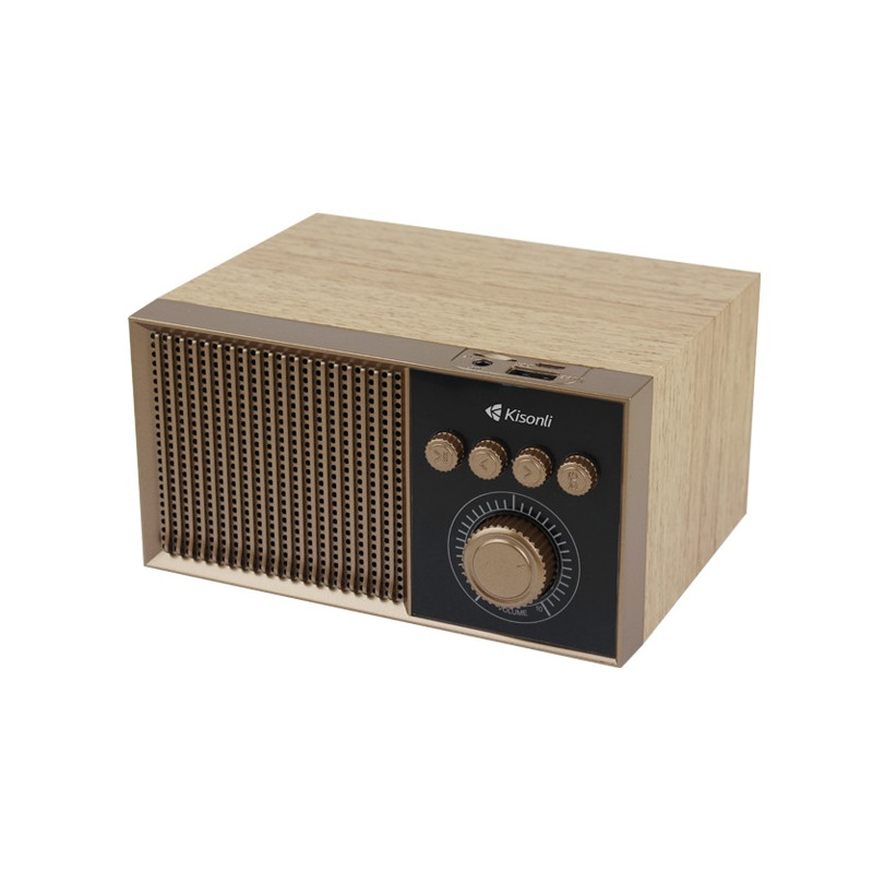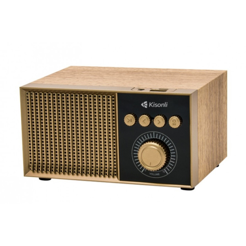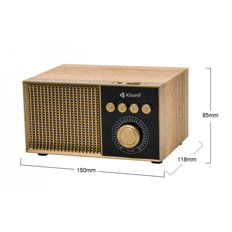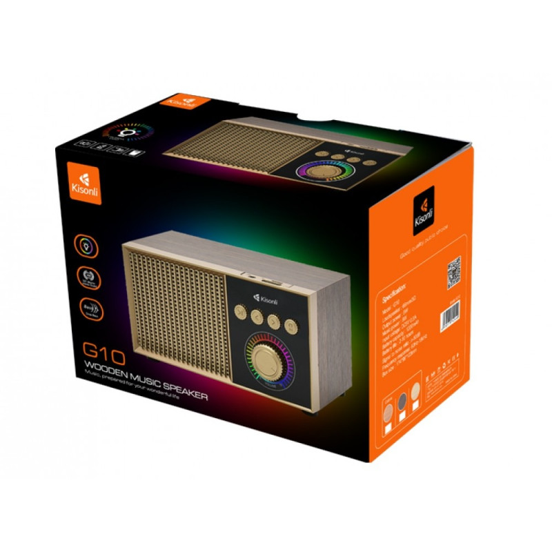 Haut-parleur de téléphone en bois Kisonli G10 -  Puisasnce : 5W - Connectivité : Bluetooth 5.0 - Distance Maximale : 10 m - Btterie : 1200mAh - Port de charge Type-C - Autonomie : 2-10 heures - éclairage RGB - Emplacement pour carte SD - Radio FM, AUX - Dimensions : 150 x 118 x 85 - Poids 415 g - Couleur : marron