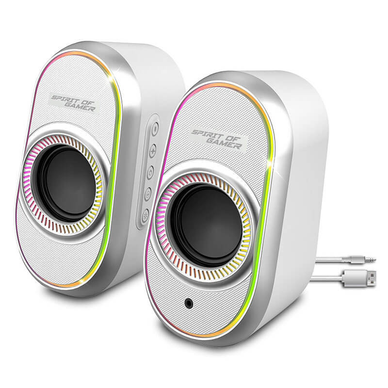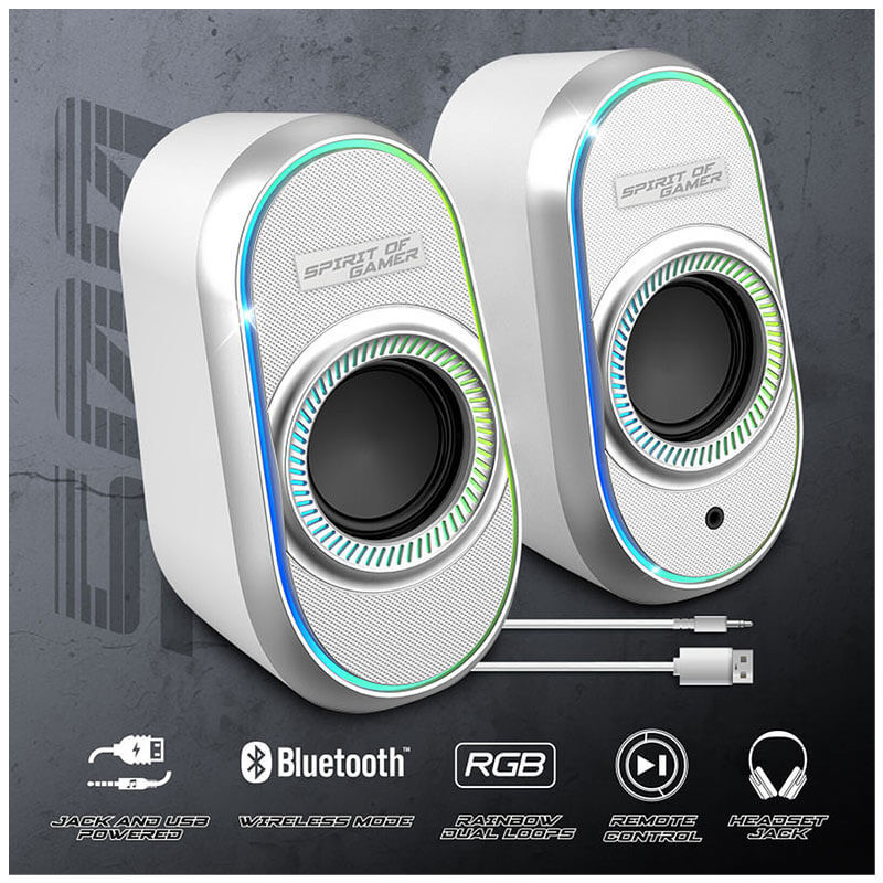 Haut-parleur Gamer Sans Fil SPIRIT OF GAMER Fanatic 500 RGB - Haut-parleur stéreo avec puissance de 12 Watts - Puissance totale : 6 W RMS (2 x 3 W) - Double connectivité : Bluetooth 5.1, Filaire (Jack 3,5 mm et USB) - compatibilité : Télé, Pc, consoles de jeu, smartphones, tablettes, et lecteurs de musique - Rétro-éclairage RGB - Alimentation USB (DC 5V) - Longueur du câbles Jack et USB de 1 m - dimensions : 18,4 x 8,7 x 9,4 cm - poids 1 kg - Couleur : Blanc - Garantie 1 an