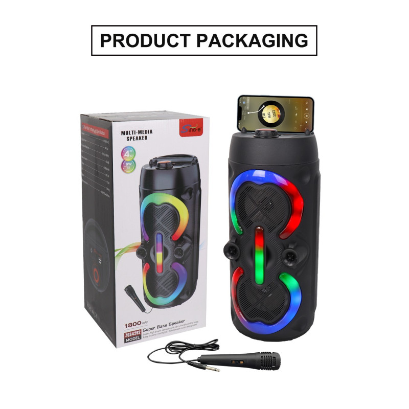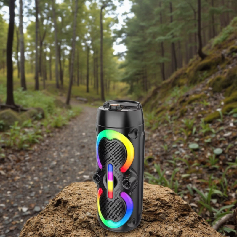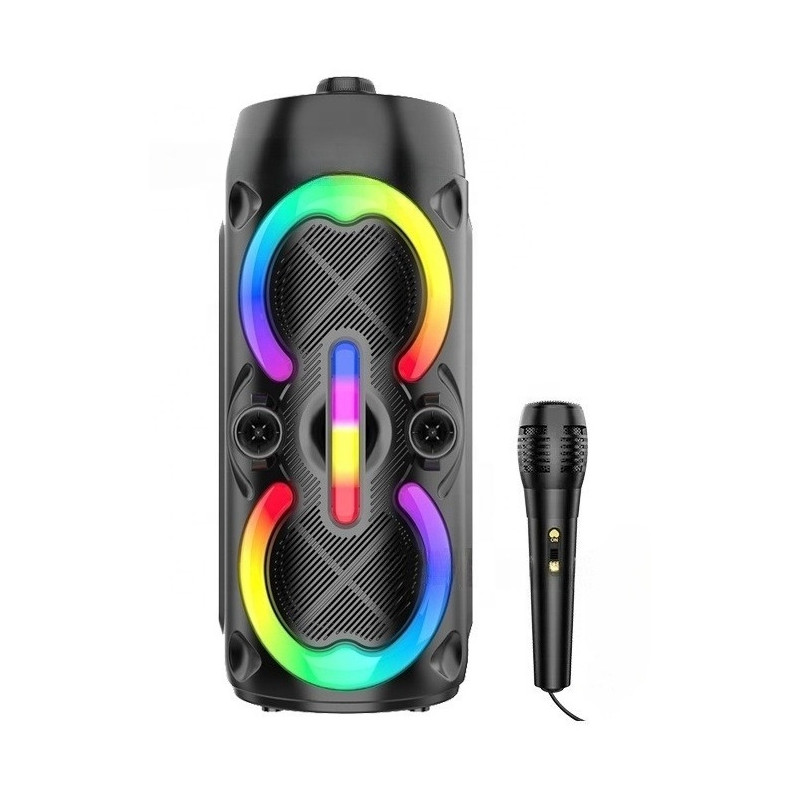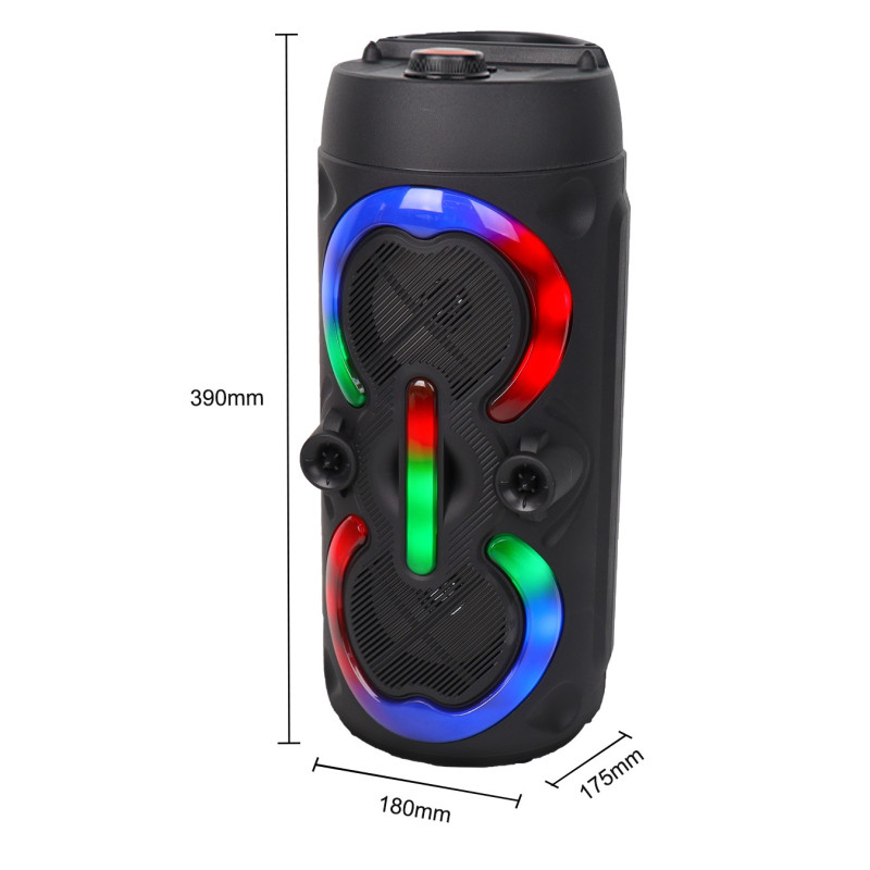 Haut-parleur DJ sans fil - Puissance : 18W - Connectivité : Bluetooth 5.0 - Distance de fonctionnement : 15 m - dual speakers - Emplacement carte mémoire - Système TWS - Interface : USB, AUX - Champ sonore haute puissance - Microphone filaire - Radio FM - lumière colorée RGB - contrôler les effets d'éclairage - Batterie 1800 mAh - Couleur Noir - Garantie 1 an