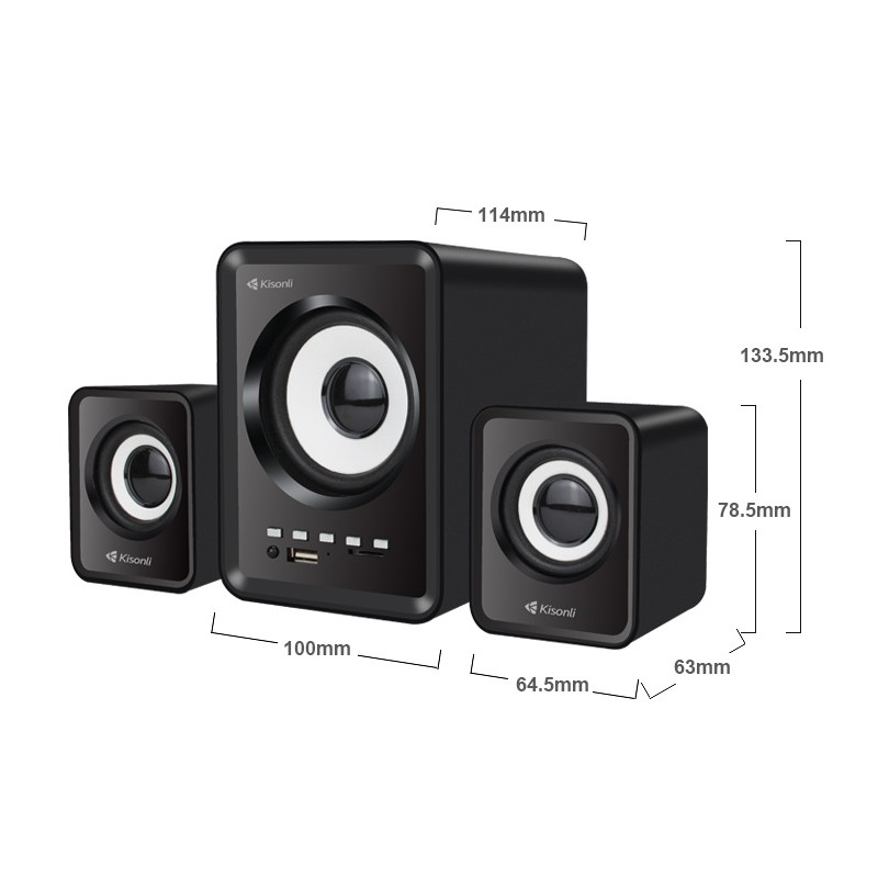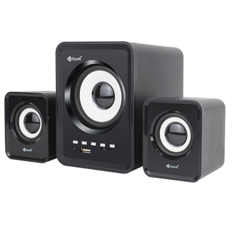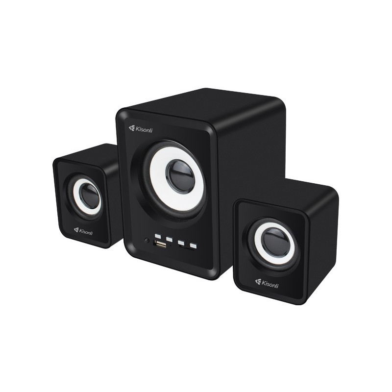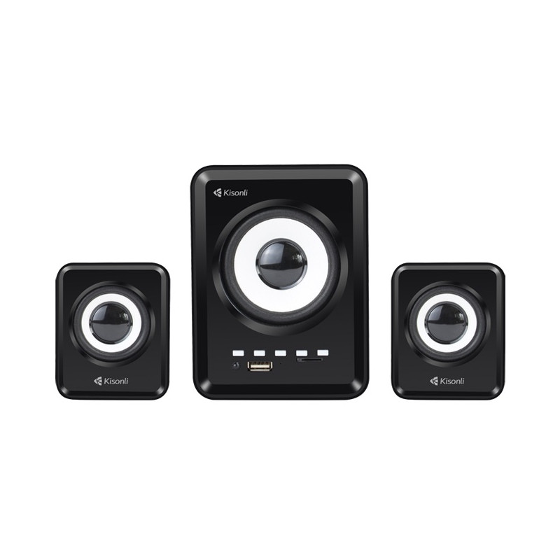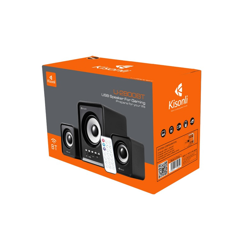 Haut-parleurs KISONLI U-2800BT - Connectivité : Bluetooth, USB, AUX - Puissance : 5W + 2x 3W - Réponse en fréquence: 20Hz-18KHz - Alimentation USB - Impédance 4Ω - signal/bruit : 60dB - Télécommande - Couleur Noir - Garantie 1 an