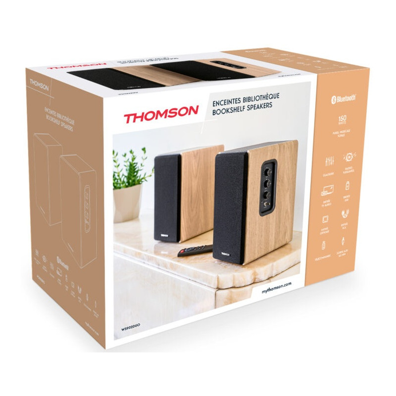 Ensemble de 2 Enceintes Sans fil THOMSON WS902DUO - Connectivité : Bluetooth 5.3 - Puissance musicale totale : 150 Watts - Bluetooth 5.3 - Entrée optique (câble inclus) - Connectiques USB & RCA (Câbles RCA vers RCA & RCA vers 3.5mm inclus) - Entrée TV Audio - Sorties AUX-IN 3.5mm & Caisson de basses (câble inclus) - Ajustement des aigus et des basses séparé - Égaliseur (musique, film, voix) - Télécommande (piles non incluses – 2 x AAA) - Alimentation secteur 230 V incluse - Garantie 1an