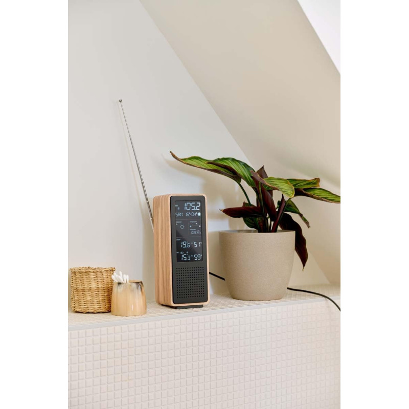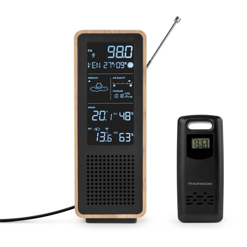 Enceinte & Station météo WS102TBK THOMSON - Ecran rétro-éclairé - Bluetooth 5.3 - Radio FM avec autoscan - Station météo avec sonde extérieure sans fil et horloge DCF - Affichage de la température intérieure et extérieure (Celsius) - Affichage des phases de la lune et des prévisions météorologiques - Affichage de l'hygrométrie - Affichage de l'heure (12/24h) et de la date - Mesure de la qualité de l'air - Dimmer 4 intensités - Antenne télescopique - Sonde extérieure sur piles (2xAAA non incluses) - Température intérieure et extérieure (sonde incluse) - Pression atmosphérique - Garantie 1an