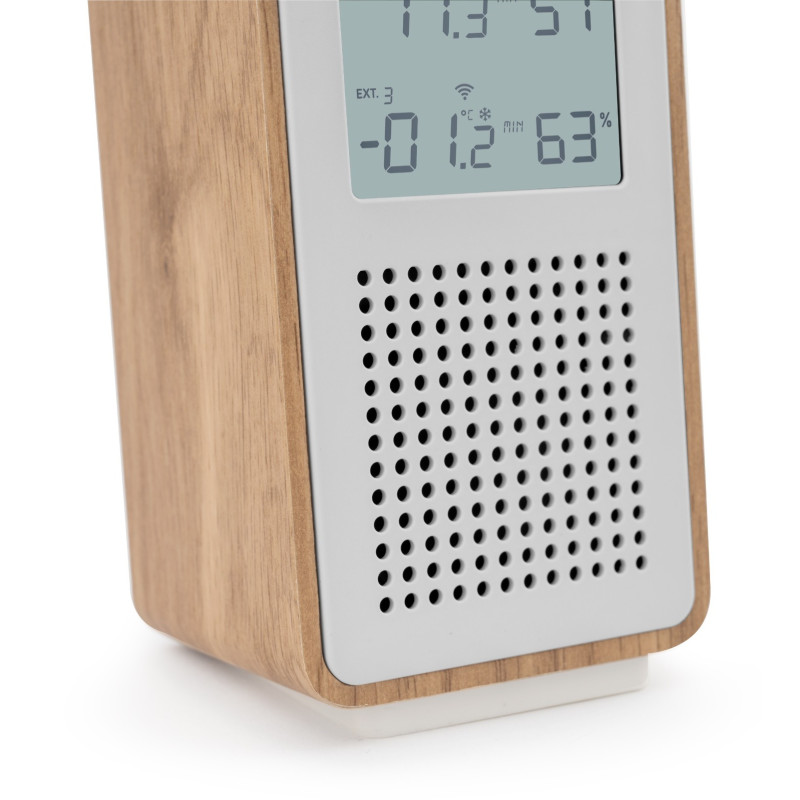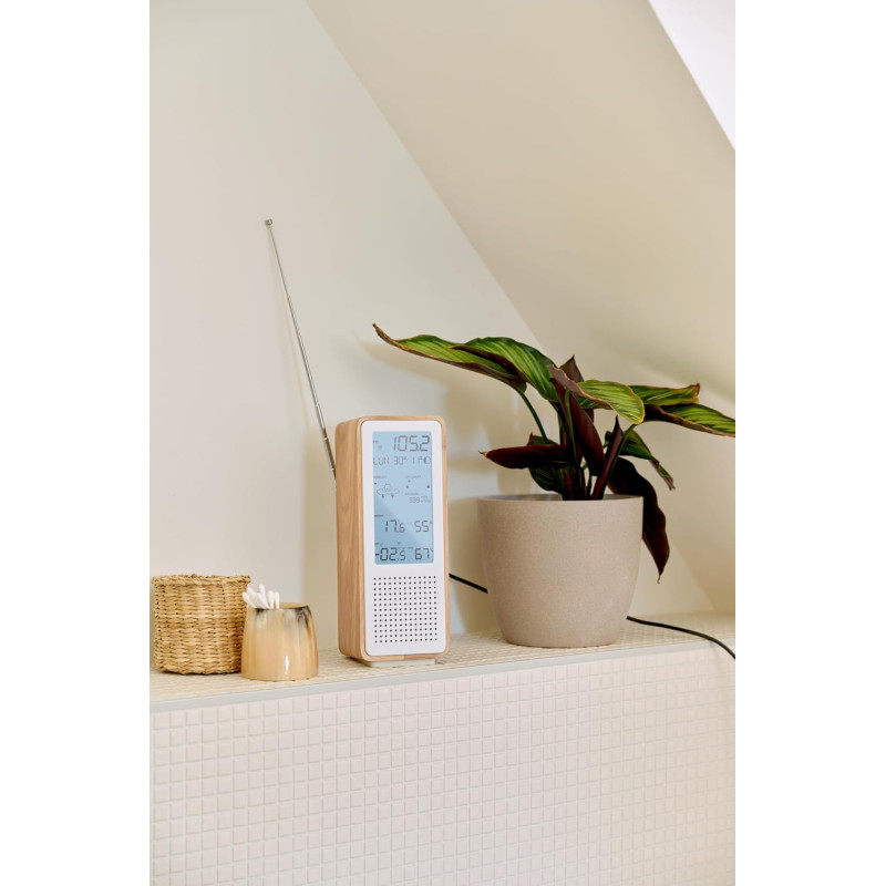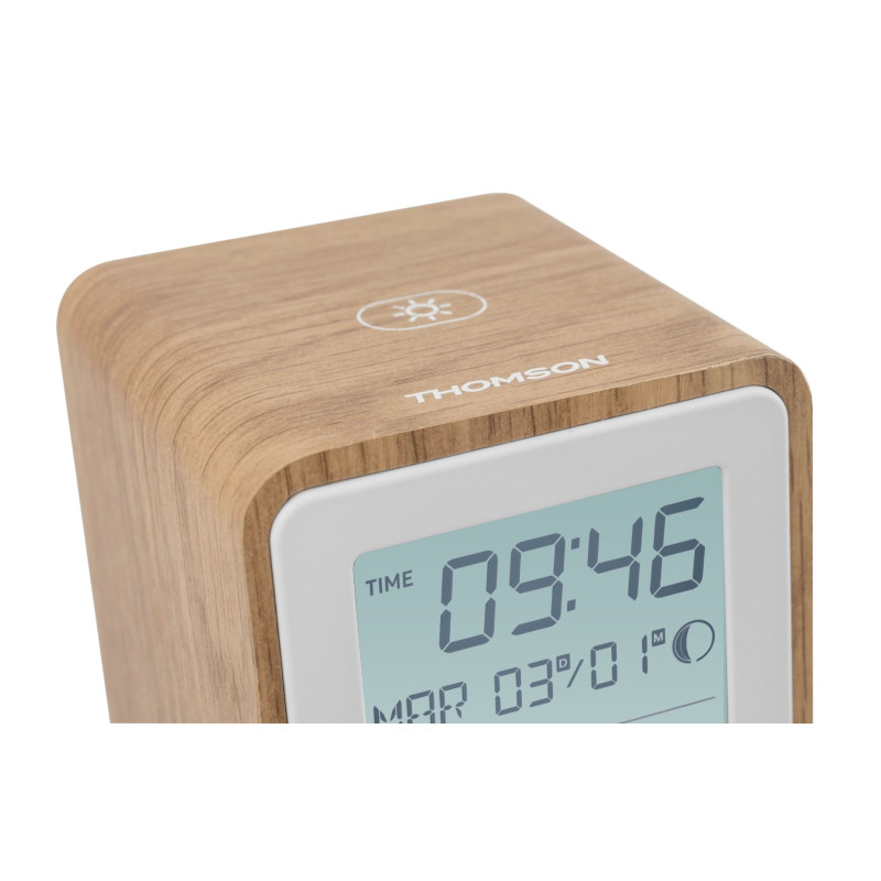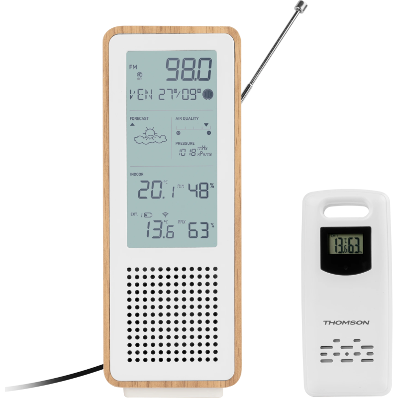 Enceinte & Station météo WS102TWH THOMSON - Ecran rétro-éclairé - Bluetooth 5.3 - Radio FM avec autoscan - Station météo avec sonde extérieure sans fil et horloge DCF - Affichage de la température intérieure et extérieure (Celsius) - Affichage des phases de la lune et des prévisions météorologiques - Affichage de l'hygrométrie - Affichage de l'heure (12/24h) et de la date - Mesure de la qualité de l'air - Dimmer 4 intensités - Antenne télescopique - Sonde extérieure sur piles (2xAAA non incluses) - Température intérieure et extérieure (sonde incluse) - Pression atmosphérique - Garantie 1an