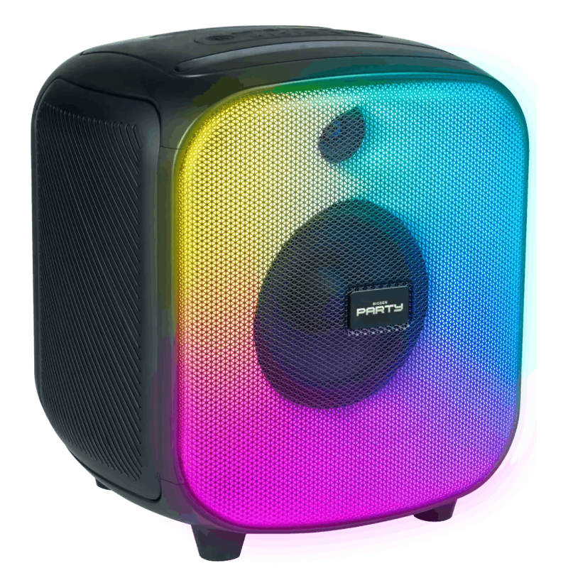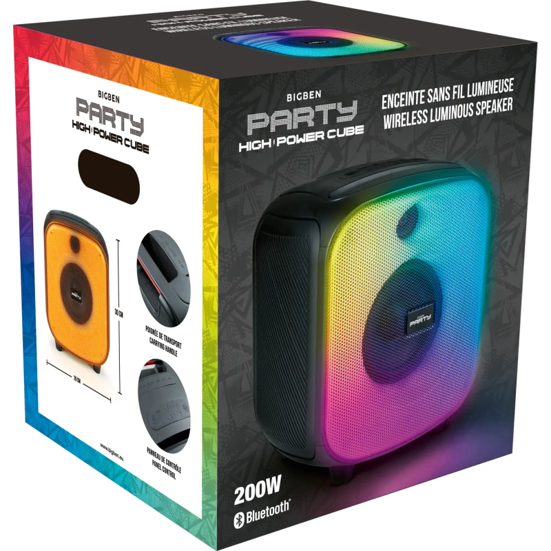 Enceinte lumineuse sans fil CUBE BIGBEN - Bluetooth 5.3 - Puissance musicale totale : 200 W - Réglage du volume - Renforcement des basses - Nombreux effets lumineux - Entrée USB, Entrée micro-SD, Entrée AUX-IN, Entrée micro filaire 6.35 mm - batterie rechargeable Li-on 4000 mAh - Poignée de transport - TWS : appairez deux PARTYBTHPCUBE pour un effet stéréo et doubler la puissance musicale - IPX4 Résistant aux éclaboussures et à la poussière - Couleur Noir - Garantie 1an