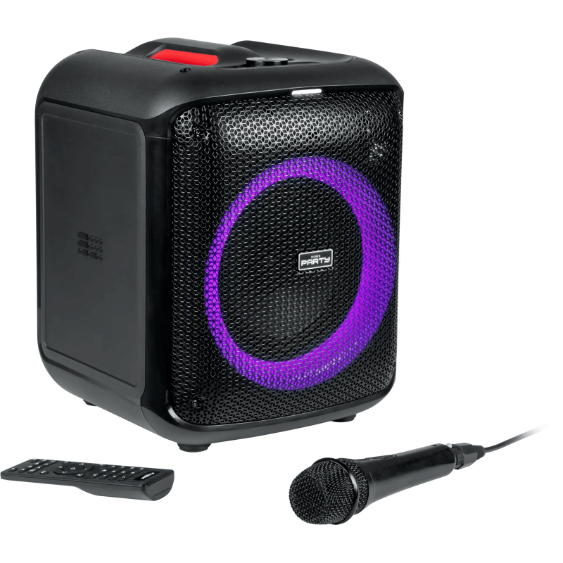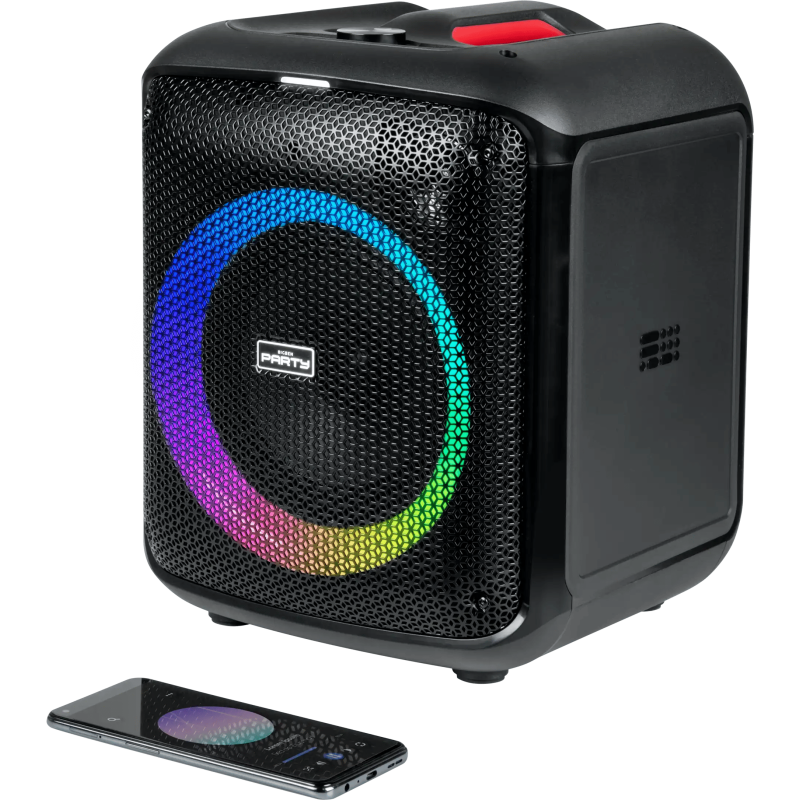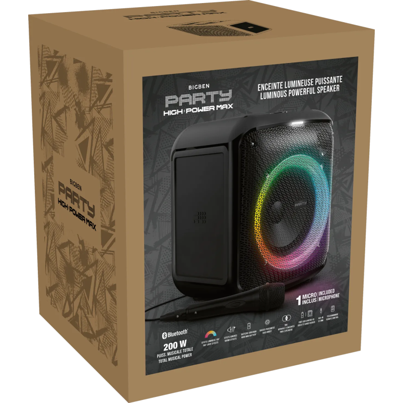 Enceinte lumineuse puissante sans fil BIGBEN - Bluetooth 5.3 - Idéal pour les Karaokés - 1 micro filaire inclus (câble 2m) - Puissance musicale totale : 200 Watts - Effets "Echo" avec le micro - Réglage du volume - Renforcement des basses - Nombreux effets lumineux - Entrée USB, Entrée Micro SD, Entrée AUX-IN, Entrée Micro filaire 6.35mm, Poignée de transport - TWS: couplez le CUBE avec un autre CUBE pour un effet stéréo et doubler la puissance musicale - Télécommande avec son d'animation intégrés (piles non incluses 2xAAA) - Fonctionne sur secteur ou batterie rechargeable Li-on 6000 mAh - Adaptateur secteur 18W inclus - Couleur Noir - Garantie 1an