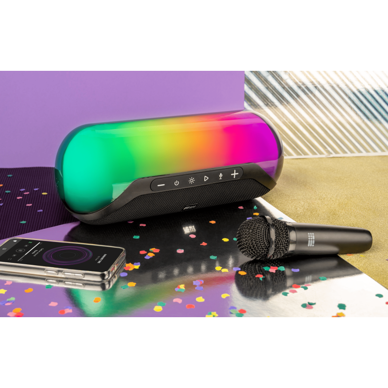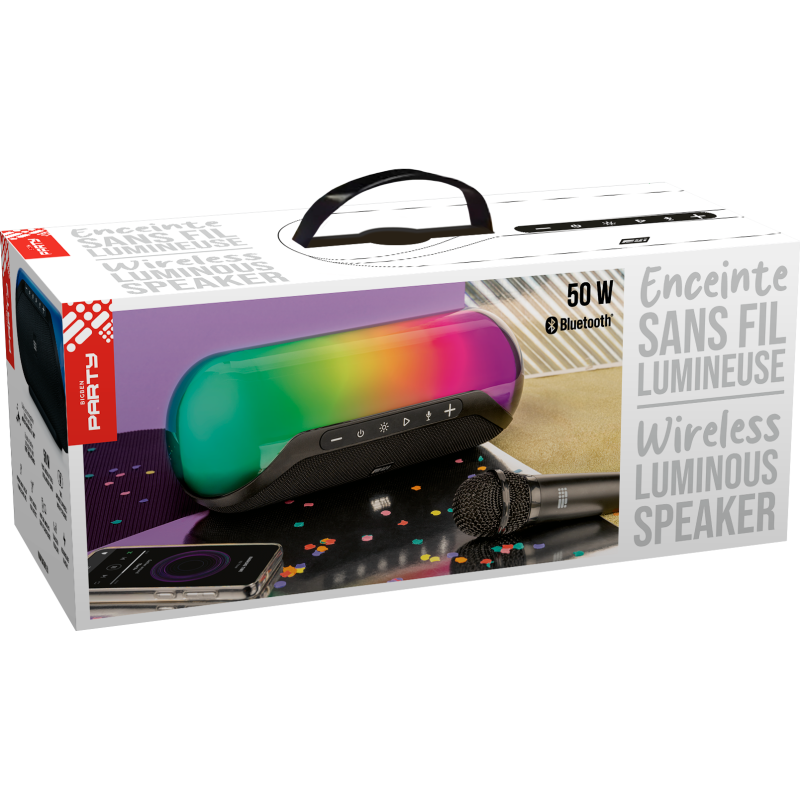 Enceinte lumineuse sans fil BIGBEN PARTYBTLITE2 - Bluetooth 5.0 - Puissance totale musicale 50 W - TWS : Jumelage de deux enceintes PARTYBTLITE2 - Batterie 1200 mAh : Rechargeable par USB-C - Lecture USB (MP3), Lecture Carte Micro SD - Effets lumineux - Poignée de transport - Egaliseur - Microphone sans fil inclus - Modificateur de voix et son animés - Couleur Noir - Garantie 1an