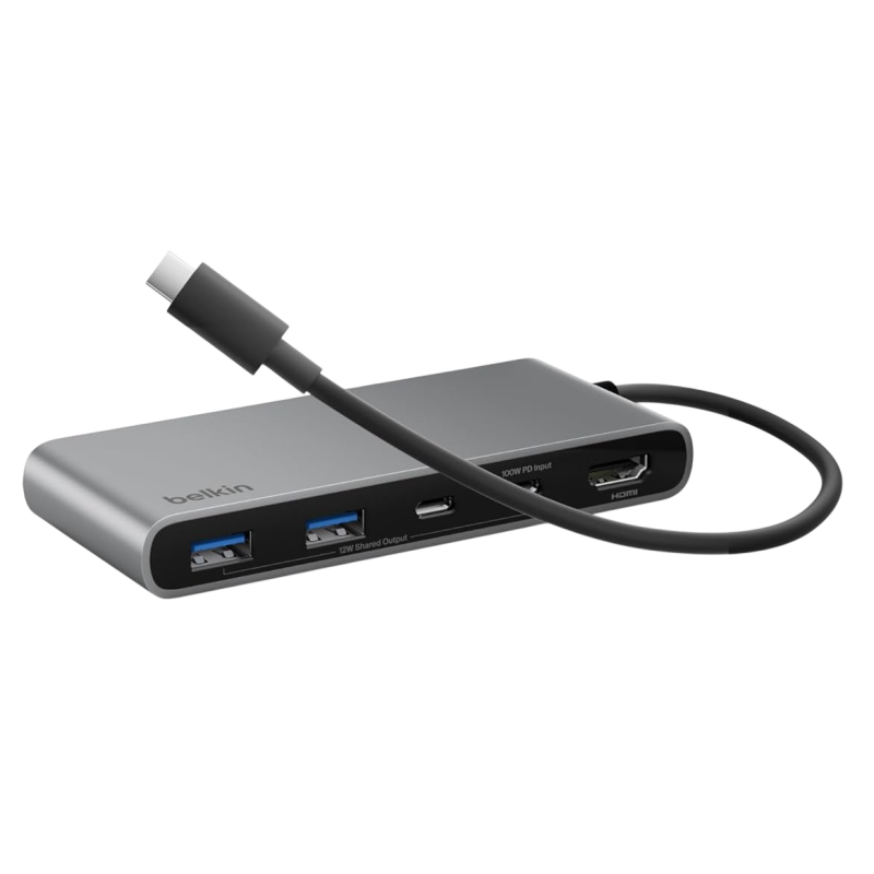 Hub USB-C Belkin avec 7 ports - Ports : 2 ports USB-A, 1 port USB-C, 1 port USB-C Power Delivery (PD) 3.0, 1 port HDMI 2.0, 1 lecteur de cartes SD et micro SD - Câble USB-C intégré (20 cm) - Prise en charge des résolutions d'images UHD jusqu'à 4K à 60 Hz - Power Delivery pouvant atteindre 100 W pour alimenter votre appareil hôte tout en restant connecté aux périphériques - Transferts de données rapides pouvant atteindre 5 Gbit/s - système de sécurité en 5 points : protection contre les surcharges, les surintensités, les surchauffes, les court circuits et matériaux résistants à la combustion - Garantie 1 an