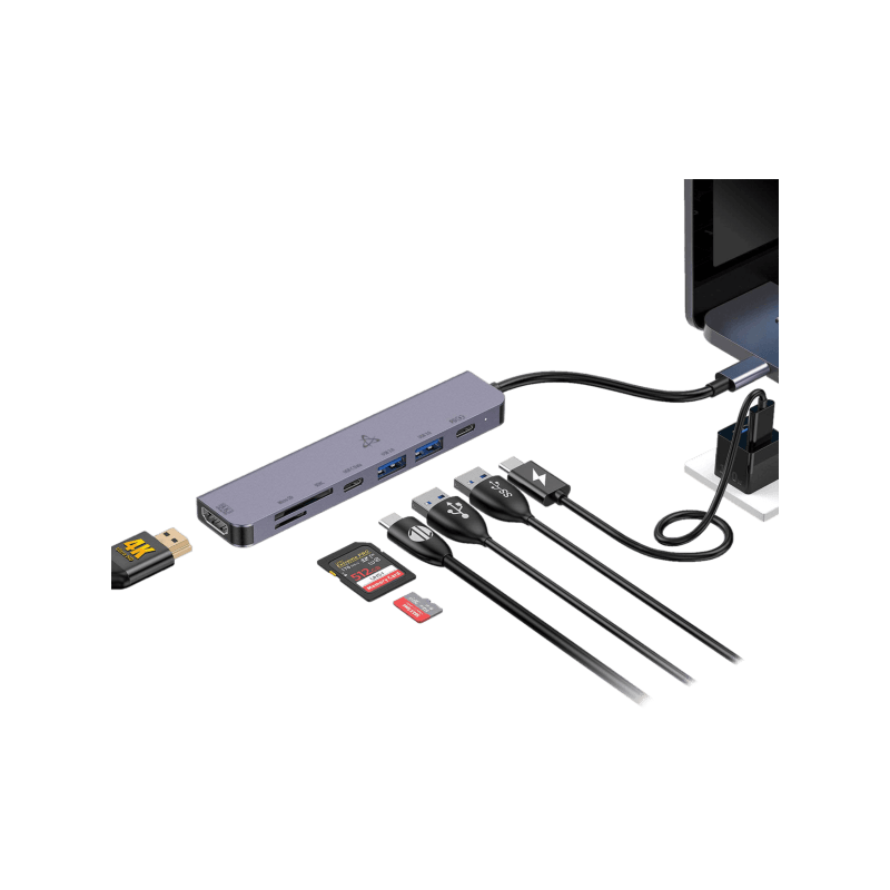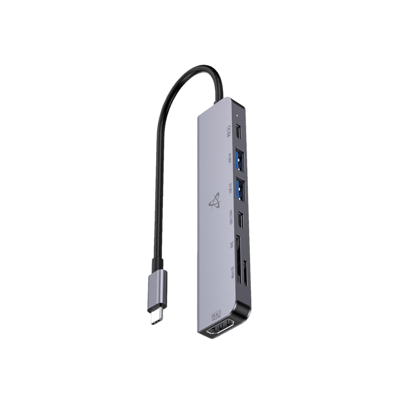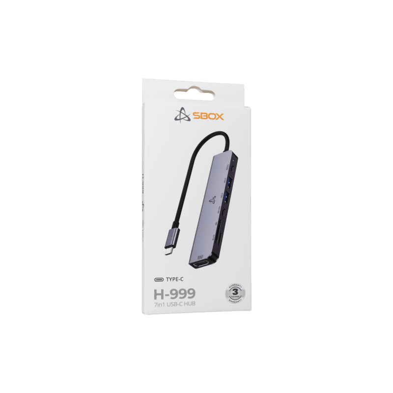 Hub SBOX 7en1 H-999 - Interface : TYPE-C - 1 port HDMI (4K à 30 Hz), 1 port USB-C (100 W PD 3.0 pour la charge), 1 port USB-C (480 Mbit/s), 1 port USB 3.0 (5 Gbit/s), 1 port USB 2.0 (480 Mbit/s), 1 lecteur de carte microSD, 1 lecteur de carte SD - Longueur du câble : 0,1 m - un port HDMI 4K, une charge rapide USB-C de 100 W, un port USB 3.0 haute vitesse - Couleur Gris - Garantie 1 an