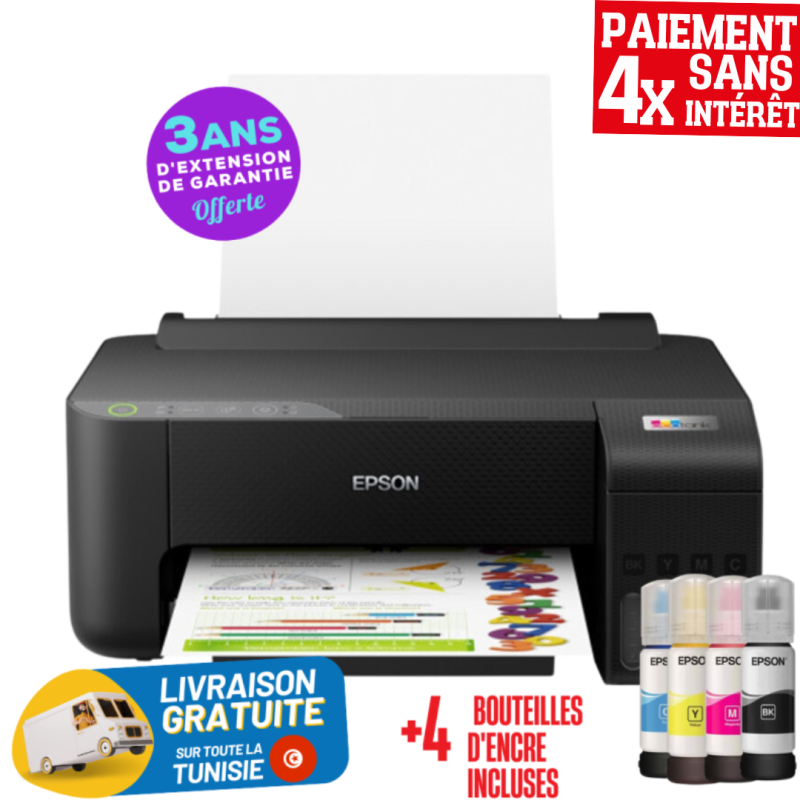 4 * Paiement sans intérêt - Imprimante Monofonction à réservoir intégré Epson ECOTANK L1250 - Formats de papier A4 - Résolution de l’impression : 5.760 x 1.440 Dpi (ppp) - 4 couleurs - Vitesse d’impression : 33 pages/min Monochrome (papier ordinaire), 15 pages/min Couleur (papier ordinaire) - Capacité fournie : 8 100 pages en monochrome et 6 500 pages en couleur - Système de réservoir d’encre simple - Système de réservoir d’encre simple - Application Epson Smart Panel : Configuration, surveillance, impression sans fil et plus encore depuis votre appareil mobile - Capacité du bac à papier : 100 Feuilles Standard - Connexions : USB, Wi-Fi, Wi-Fi Direct - Couleur : noir - Garantie 1 an