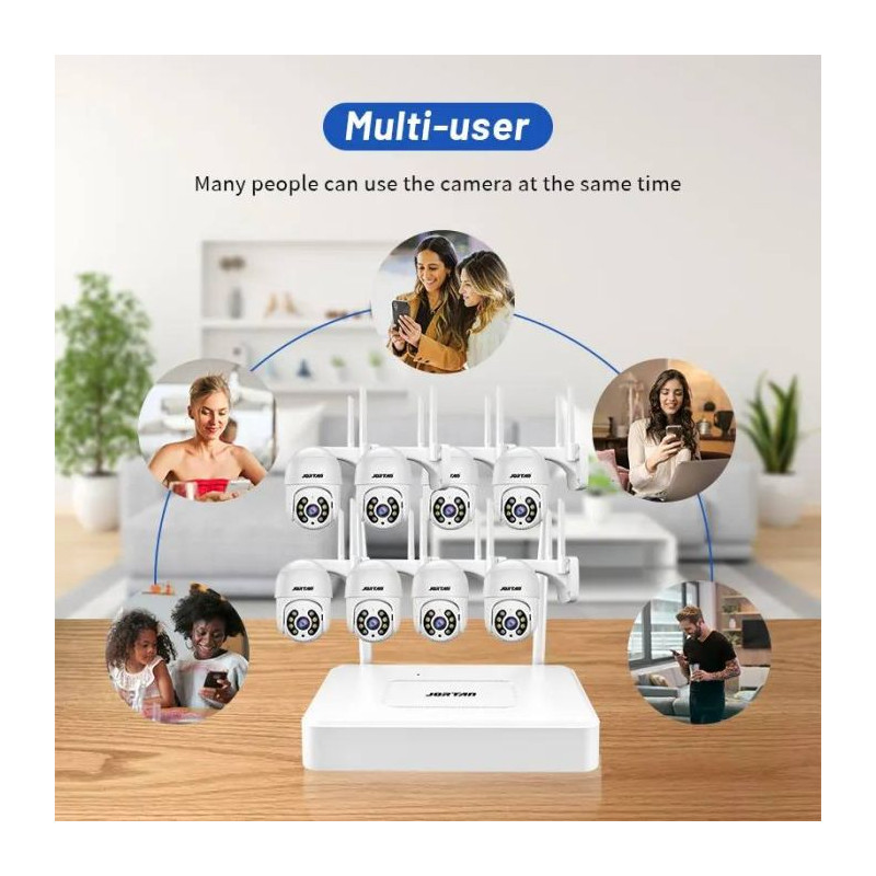 Kit de Surveillance JORTAN 8 Caméras Externes 2MP avec Écran 15.6" Full HD - Résolution: 1920 x 1080 (2MP) - Connectivite: Wifi - format de compression vidéo: H.265 - Format du Capteur: CMOS - 8 channels - 8in1 - Audio bidirectionnel - étanche à l'eau: IP66 - Garantie 1an