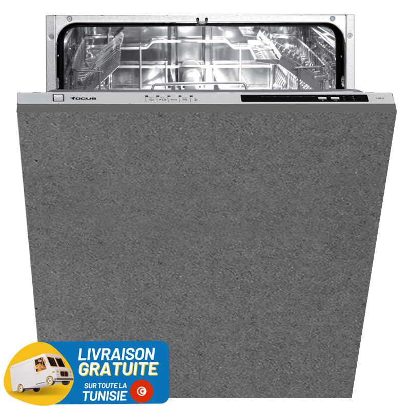 Lave-Vaisselle Focus F501X - Totalement encastrable - 12 couverts - 5 programmes + 4 températures - Classe énergétique A++ - Ecran LED - Demi-charge - Départ différé 3 – 6 – 9 h - Puissance acoustique : 57 dB(A) - Pieds réglages - Faible Consommation : 12 Litres - Indicateur son fin de programme - Dimension : 82 x 60 x 57 cm - Couleur Silver - Garantie 2 ans + Livraison Gratuite