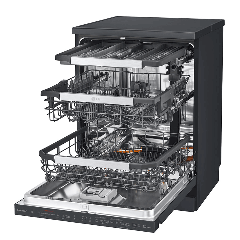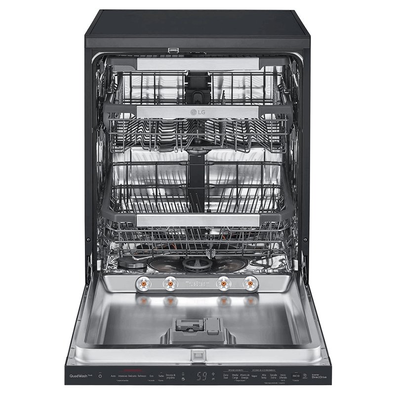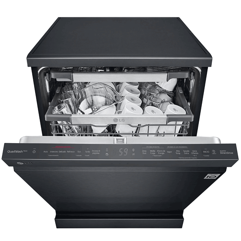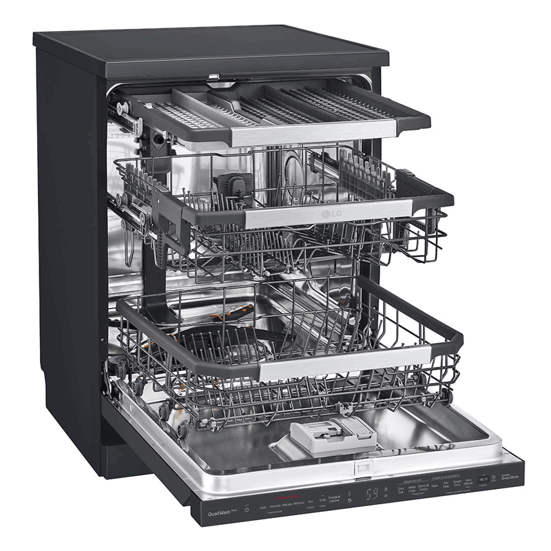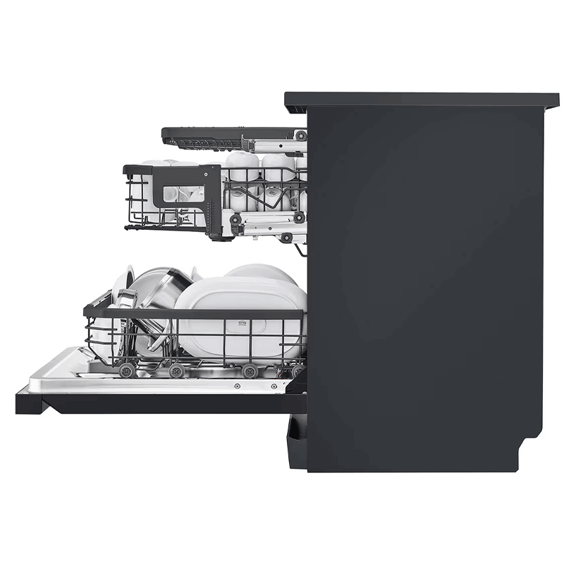 Lave Vaisselle LG - Nombre de couverts : 14 Couverts - Nombre de programmes : 8 Programmes - TrueSteam laisse les plats étincelants de propreté tout en réduisant les taches d'eau jusqu'à 30% - ThinQ - Smart Diagnosis - Troisième étagère réglable en hauteur - Niveau Sonore : 41dB - Dimensions (LxHxP) : 598 x 845 x 600mm - Couleur : Noir - Garantie 2ans + 10 ans sur moteur