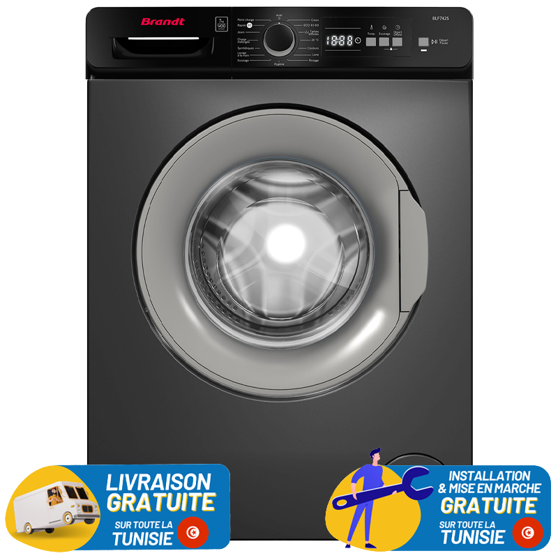 Lave linge BRANDT - Capacité : 7KG - vitesse d'essorage : 1400tr/min - Classe énergétique : A+++ - Départs Différés - Nombre de programmes : 15 Programmes - Rinçage + Essorage - Lavage Rapide - Bandeau NOIR - Affichage électronique - Couleur : Silver - Garantie 2ans