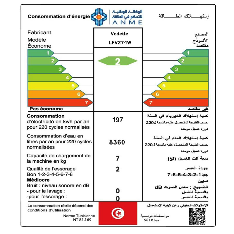 Machine à Laver VEDETTE - Capacité de lavage : 7kg - Classe énergétique : 2 - Type d'ouverture : Frontale - Vitesse d'essorage : 1400tr/min - Nombre de programmes : 15 programmes - Puissance Maximale : 2100W - Volume tambour : 45 Litres - Angle d'ouverture : 180°C - Diamètre du hublot : 30cm - Sécurité hydraulique Anti débordement - Matériau tambour Inox - Ouverture de la porte Gauche - Consommation d'eau annuelle : 8360 Litres - Consommation d'électricité annuelle : 197Kwh - Affichage du temps restant - Options Départ différé - Système anti balourd - Sécurité enfants - Poids net : 64Kg - Dimensions (HxLxP) : 845 x 597 x 497mm - Couleur : Blanc - Garantie 2ans