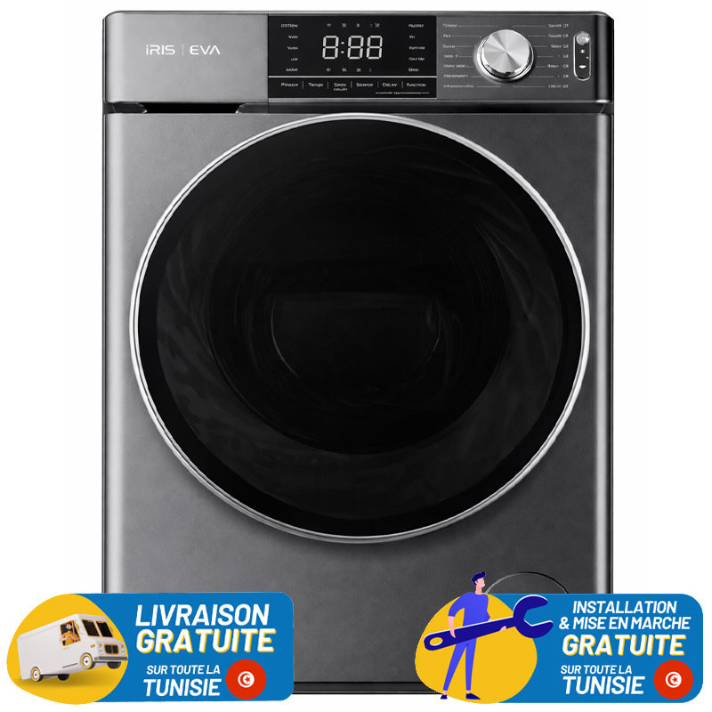 Machine à Laver Automatique IRIS EVA - Capacité de lavage : 12 Kg - Vitesse d'essorage : 1400 Tr/min - Nombre de programmes : 14 Programmes - Stérilisation a haute température - Direct Drive Moteur - Classe énergétique : A+++ - Auto balance fonction qui détecte et réduit les vibrations du tambour - Redémarrage automatique en cas de coupure de courant - Départ Différé - Auto Nettoyage - Couleur : Dark Silver - Garantie 1an