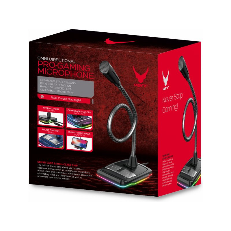 Microphone Gaming Omega Varr VGMD1 RGB - Microphone de bureau avec perche flexible - Omnidirectionnel - Fréquence de réponse: 70 – 10 000 Hz - Sensibilité -58dB ±2dB - Impédance 2,2 kΩ - Connecteur USB - Longueur de câble 1.5 m - Couleur Noir - Garantie 1 an