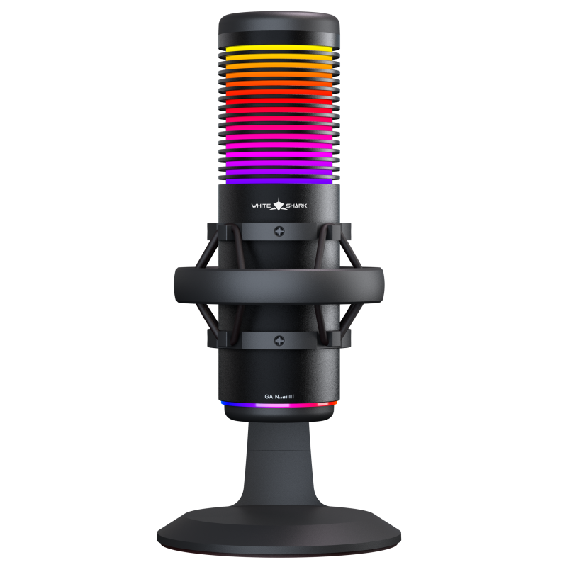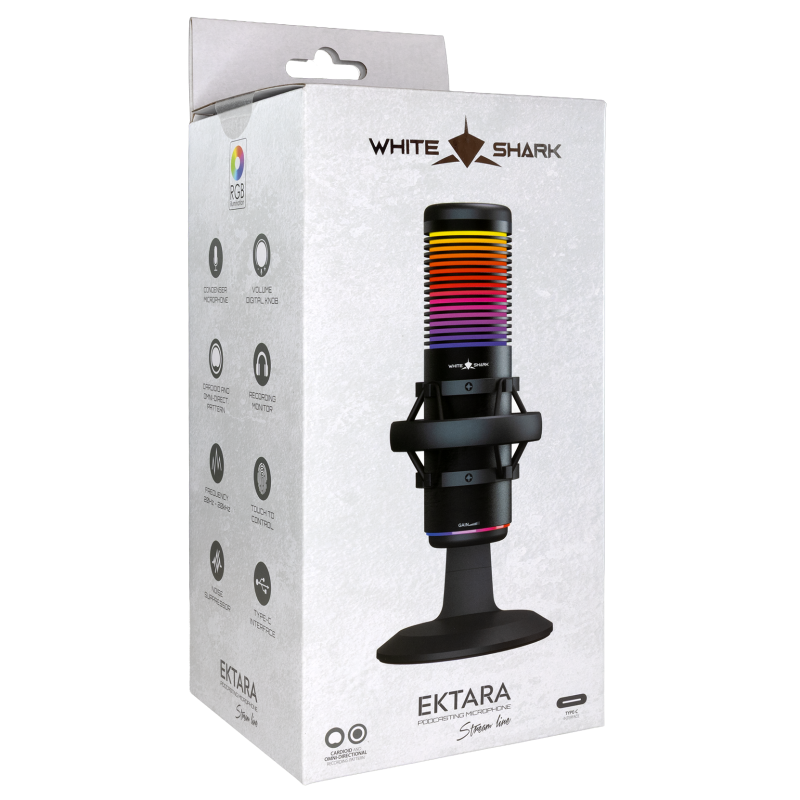 Microphone Gaming White Shark EKTARA DSM-07 - Microphone : Condensateur x 2 - Directivité : 1 x cardioïde, 1 x omnidirectionnelle - Sensibilité du microphone (dB) : -38 dB ±3 dB - Connecteur 1 : USB A -> USB C - Rapport signal/bruit : 85 dB - Débit binaire : 192 kHz / 24 bits-a - éclairage : RGB - Longueur de câble : 2 m - Poids : 390 g - Couleur Noir - Garantie 1 an