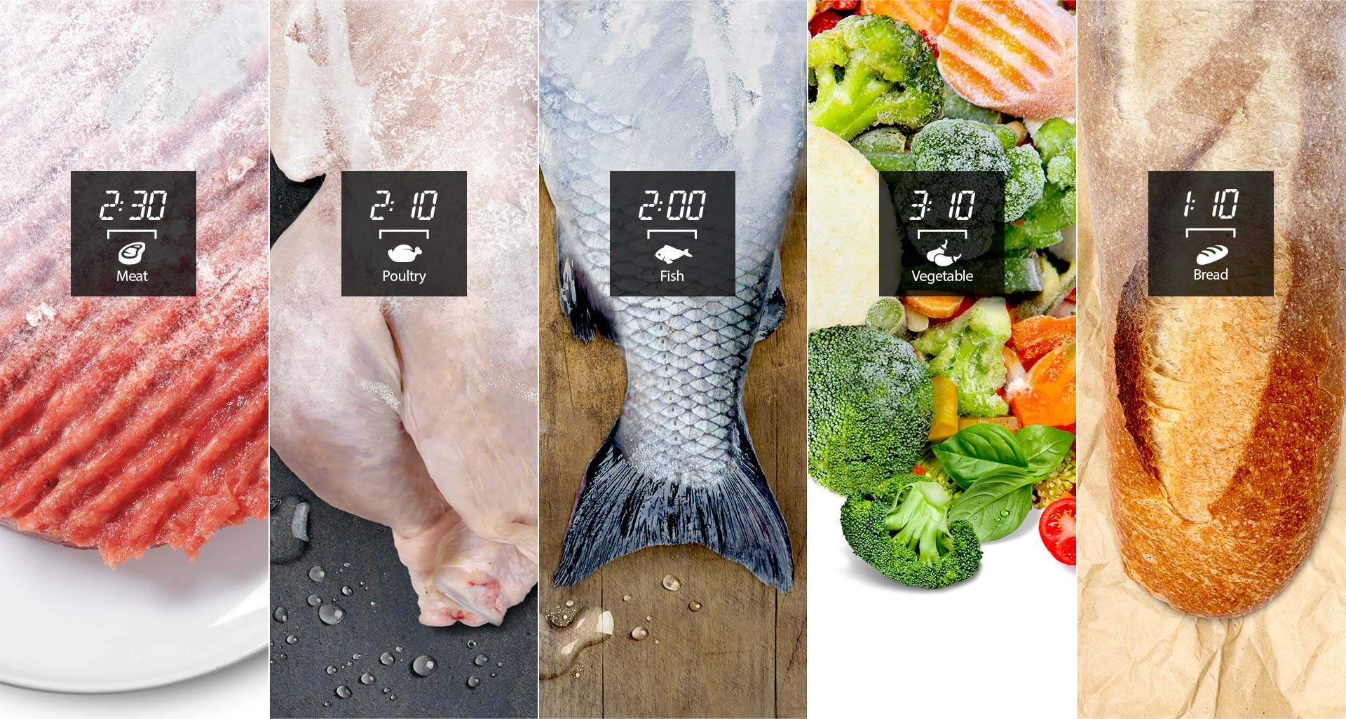 La fonction Décongélation rapide permet une décongélation rapide et uniforme des aliments. Le système calcule automatiquement la durée de décongélation adaptée pour cinq types d'aliments différents. Ainsi, la préparation des ingrédients prend beaucoup moins de temps.