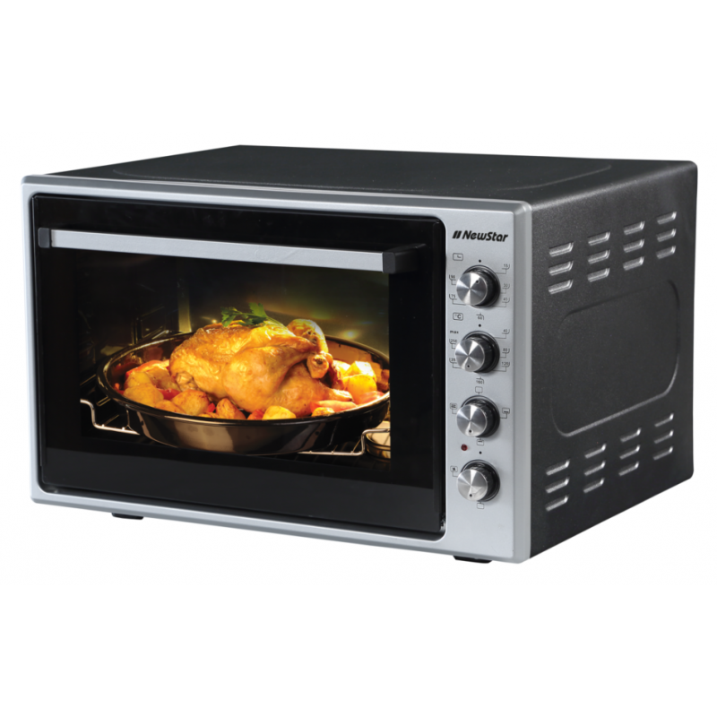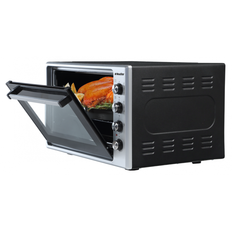 Four électrique NewStar MF-70V - Capacité 70 L - Puissance 1750 Watts - 6x programmes - Alimentation 220-240 / 50-60 Hz - Minuterie de cuisson Réglable 90min avec sécurité automatique - Thermostat réglable de 50°C à 250°C - Porte à double Vitrage , résistant à la chaleur - Chaleur Tournante - 4 Boutons de command - Esolation complete - Lampe interieure - Témoin lumineux Marche/Arrêt - Fond de four emaillé - 2x Plateaux émaillé à niveau Réglable, Grille en Acier Inoxydable - Dimensions 47.5 x 41 x 63 cm - Couleur Noir et gris - Garantie: 1 an