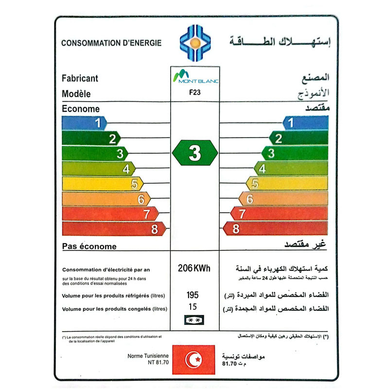 Système de Dégivrage : De Frost - Classe énergétique : 3 - Volume Net Totale : 210 Litres (Réfrigérateur : 195 Litres , Congélateur : 15 Litres) - Consommation d'énergie annuelle : 206 KWh - INVERTER : Non - Doubles Portes - Nombre d'étoiles congélateur : ★★ - Porte réversible - Dégivrage Semi automatique - Thermostat réglable - Poignées intégrées - Poids : 36 Kg - Dimensions (LxHXP) : 55 x 124 x 56 cm - Type de Gaz : R600a - Couleur : Gris - Garantie 2 ans
