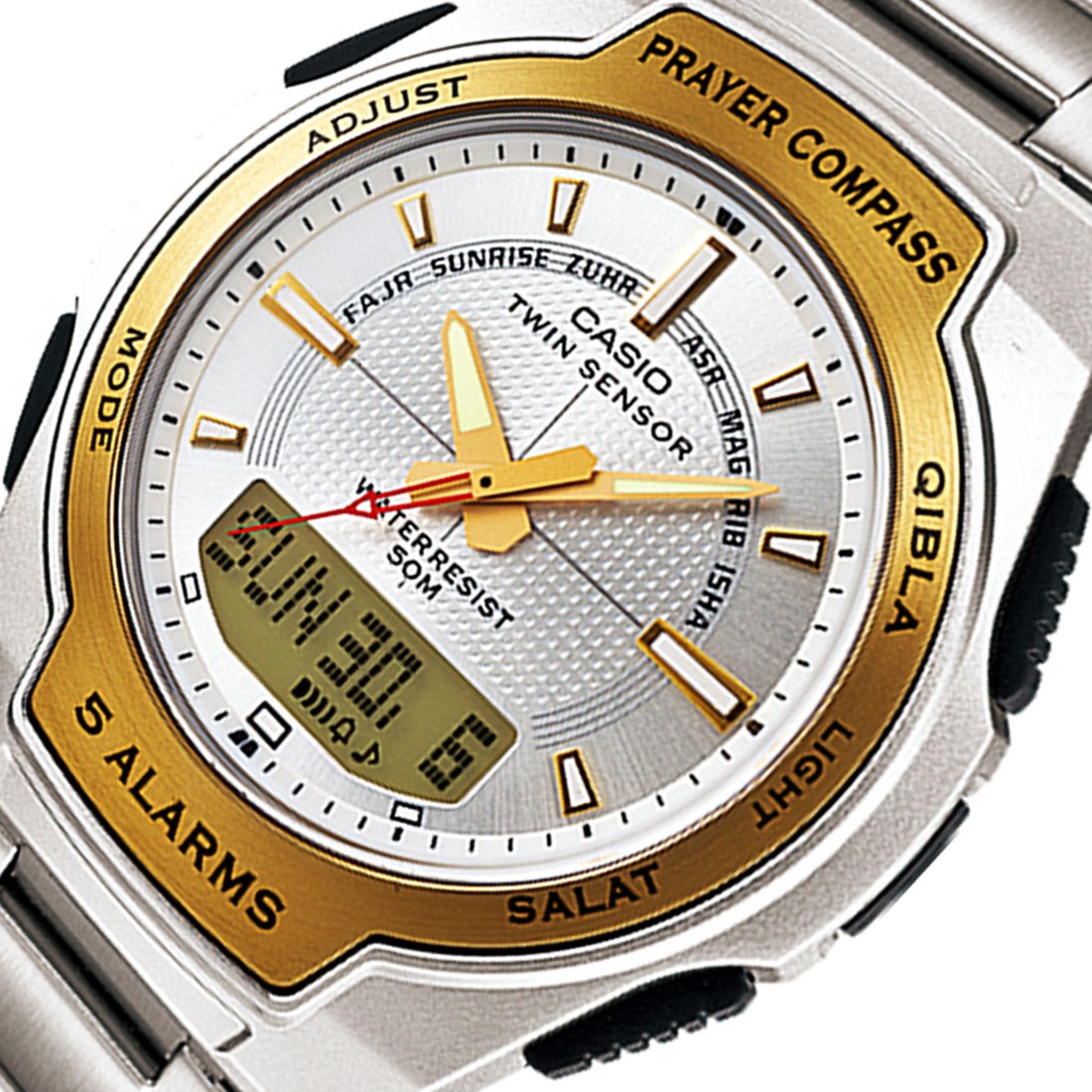 Montre Prière avec boussole pour Homme - Alarme de prière - Boussole numérique (QIBLA) - Dimensions (HxLxD): 49.8 x 44.6 x 12mm - Eclairage LED - Chronomètre 1/100 sec - 24 heures - Résistance à l'eau de 50 Mètres - Affichage date et jour de semaine - Fonction d'heure universelle - Pile durée de vie : 2 Ans - Bracelet en Acier inoxydable - Poids: 113 g