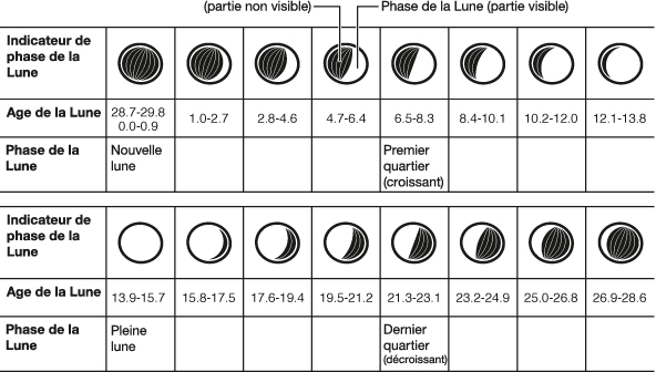 Les phases de la lune s'affichent sous forme de symboles d'après les réglages individuels de position géographique.