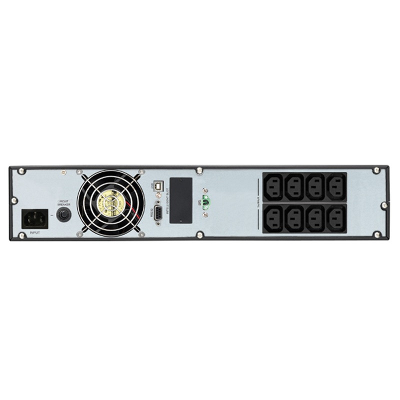 écran LCD graphique multifonction - Technologie DSP en ligne (VFI) - Puissance nominale : 2400 VA - Puissance active : 2160 W - Facteur de puissance : 0.9 - Technologie : Double conversion en ligne sans transformateur (VFI-SS-111) - Refroidissement par ventilateur - Bruit audible : < 45 dBA à 1 m - Positionnement en tour ou en rack 19'' (2U) - Nombre de phases : 1Ph+N - Tension nominale : 208 Vca/220 Vca/230 Vca/240 Vca - Fréquence nominale : 50/60 Hz (sélectionnable) - Capacité de surcharge : 110 % avertissement sonore uniquement, 110-130 % pendant 30 s, > 130 % pendant 100 ms - Efficacité 94 % - Temps de transfert : 0 ms (en ligne) - Temps de sauvegarde (typique) : 10 à 30 minutes - Température de fonctionnement : De 0 à 55 °C - Altitude maximale : 3000 m - Protection de la propriété intellectuelle : IP20 - Dimensions (UPS) L x H x P : 43,8x8,8x41 cm - Poids 19 Kg - Garantie 1 an
