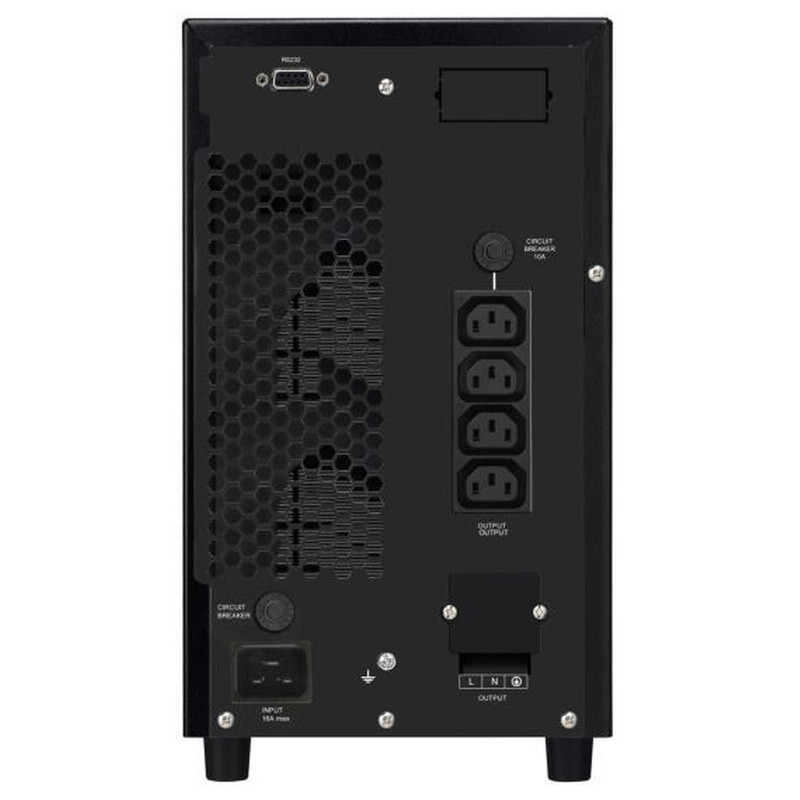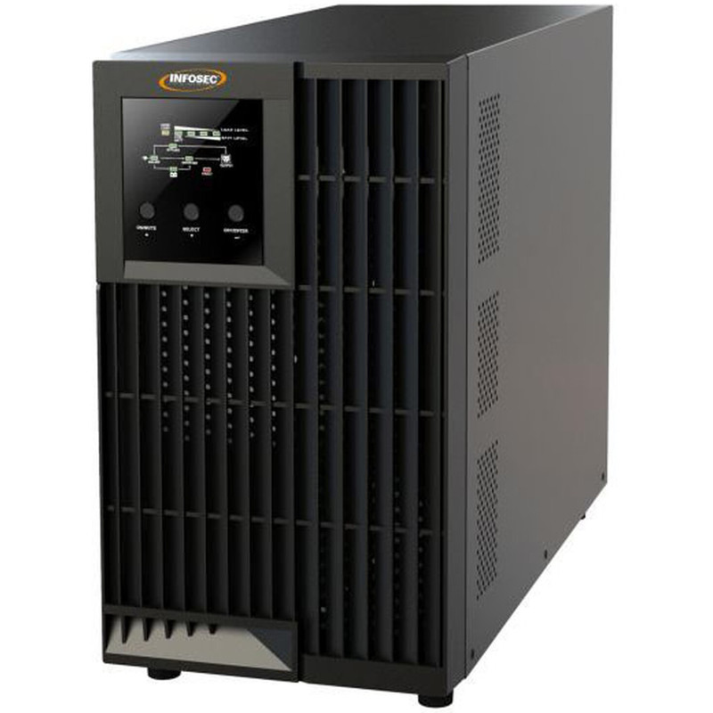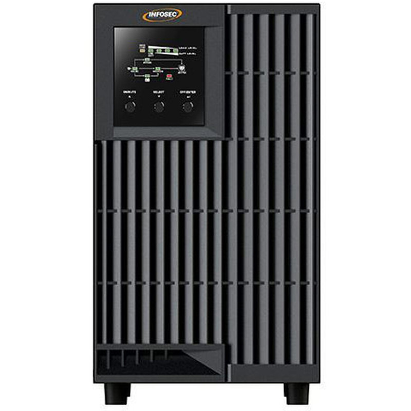 Onduleur INFOSEC E4 VALUE - écran LCD intégré affiche en temps réel des informations utiles - Puissance : 3000VA / 2400W - Format Tour - Technologie de l'onduleur : On Line Double Conversion - Phases : Monophasé/Monophasé - Obturateur de sécurité - Temps de recharge (minutes) : 4 heures à 90 % de la capacité - Autonomie à 50 % de charge (minutes) : 9 - Alarmes sonores : batterie faible, surcharge, défaut - Indicateurs visuels : Niveau de charge, Niveau de batterie, Mode secteur, Mode batterie, Mode bypass, Défaut - Fonction démarrage à froid - Garantie 1 an