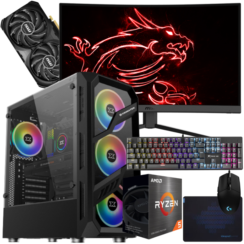 Écran Gaming Gaming Incurvé MSI G27C4 27" Full HD 170Hz - Boîtier Xigmatek Lamiya Moyen Tour RGB - Processeur AMD Ryzen 5 5600X, up to 4.6 Ghz, 35 Mo de mémoire cache - RAM 32 Go (2x 16 Go) TeamGroup DDR4 3200MHz - Disque SSD 1 To TeamGroup MS30 M.2 - Carte Graphique MSI GeForce RTX 4060 Ti VENTUS 2X OC Black, 8 Go de mémoire GDDR6 dédiée - Carte Mère ASRock B550M Phantom Gaming 4 - Boite d'alimentation AeroCool LUX 750W / 80+ Bronze - Clavier Gaming Mécanique Xtrike Me GK-915 / RGB / Blue Switch - Souris Gaming Logitech G102 Prodigy / Noir - Tapis souris Gaming Lenovo IdeaPad Gaming M / Bleu - Garantie 1 an
