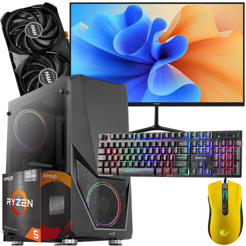 Écran Gaming AIWA MD2403 24" VA Full HD 165Hz - Boitier Zauron FRGB-G-BK-v2 - Processeur AMD Ryzen 5 5600G, up to 4.4 GHz, 19 Mo de mémoire cache - RAM 16 Go (2x 8 Go) Patriot Viper Steel DIMM DDR4 CL20 3600MHz RGB - Disque SSD 512 Go 2.5" SATA III - Carte Graphique MSI GeForce RTX 4060 VENTUS 2X BLACK, 8 Go de mémoire GDDR6 dédiée - Carte Mère Asus PRIME A520M-K - Boite d'alimentation MSI MAG A500DN / 500W ATX / 80 PLUS Standard - Souris Gaming Pro Rampage SMX-R44 RGB Jaune - Clavier Gaming Xtrike Me KB-280 / RGB / Noir - Tapis de souris Gamer Macro PubG / 700 x 300 mm - - Garantie 1 an